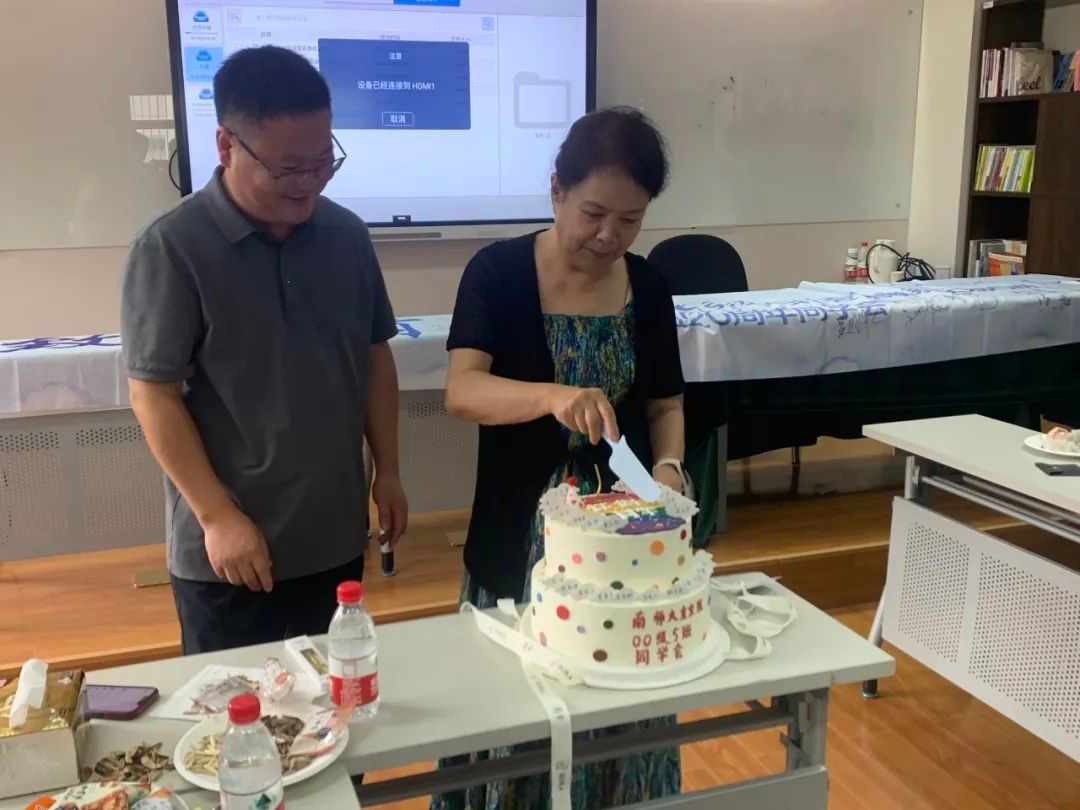 薛传会书记和劳动与社会保障系金一虹教授给校友们切蛋糕,集体过毕业20周年生日。随后师生一起座谈交流,大家一起共寻学习足迹、共话青春故事、共忆似水年华、共述今日现状、共促未来发展,气氛热烈。