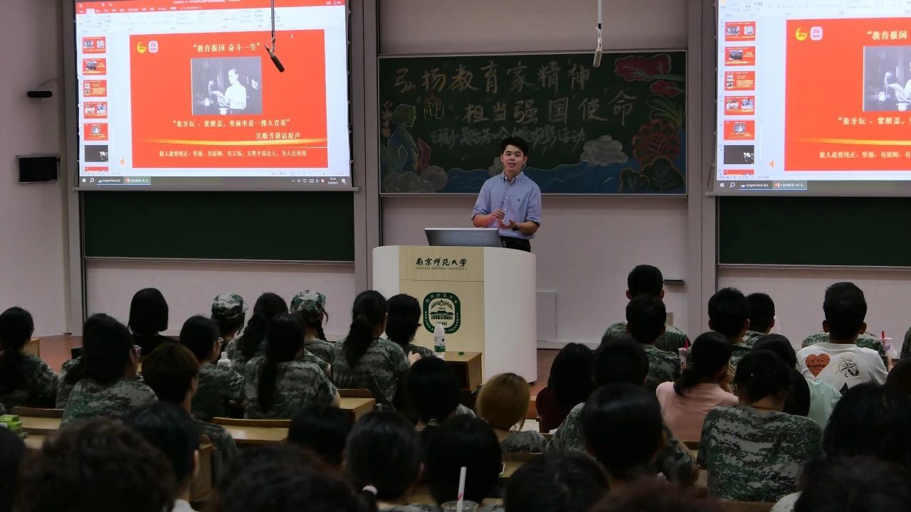 张一川以《学习南师先生故事 弘扬教育报国精神》为主题,以“新中国教师节的由来”为切入,结合“立志成才”“厚生奉献”“献身祖国”三个关键词介绍了吴贻芳校长波澜壮阔的一生和她的教育家精神。他希望同学们能带着中国教育家精神传承人的责任感去观看话剧、体会内涵。