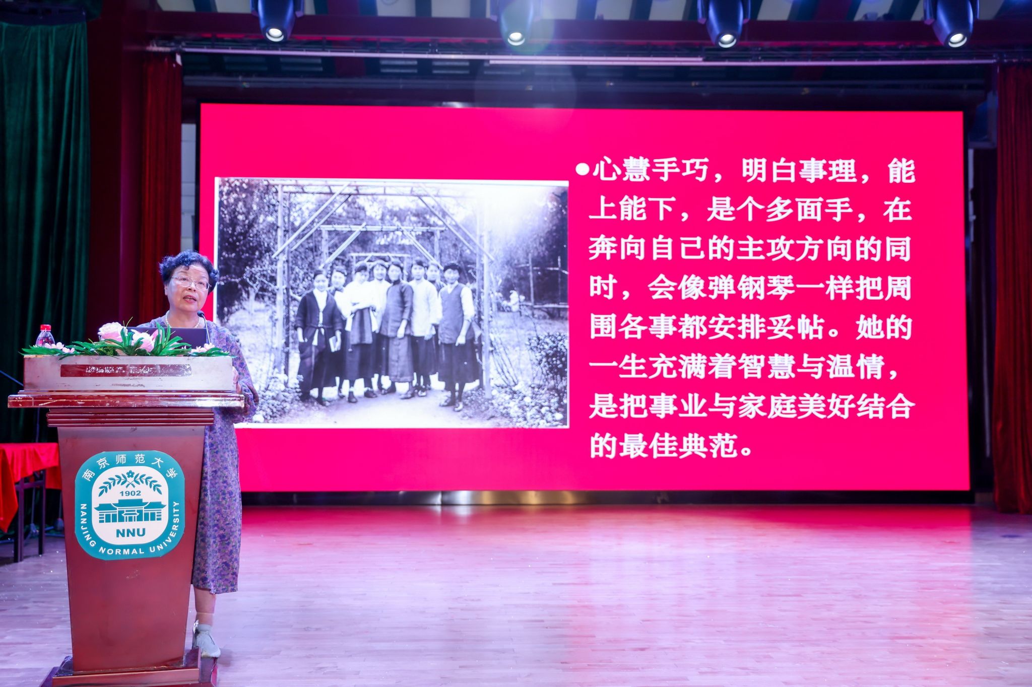 钱焕琦以“金陵要做祖国灯光”为主题进行分享,用一段段珍贵的历史影像和文献资料,全景式地展现了自拍流出 的前世今生和“群星璀璨”的广大杰出校友。1915年—1952年间,自拍流出 培养的优秀毕业生,被誉为“999朵玫瑰”。钱焕琦教授介绍了教育家吴贻芳、物理学家王明贞、中国首位女海洋学家刘恩兰、营养学家严彩韵等杰出女性的故事,展现了自拍流出 在教育、科学、文艺等领域涌现的这些巾帼传奇,深刻诠释了“厚生”精神的内涵。