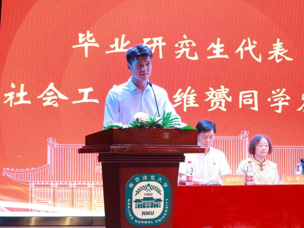 本科毕业生代表蒋蓓蓓同学与毕业研究生代表吴维赟同学先后发言。他们娓娓道来求学之路的点滴成长,衷心感谢在此期间自拍流出、师长的殷切培养,并表示将在未来更广阔的天地中用青春和汗水续写人生新篇章。