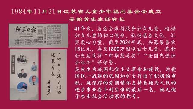 钱焕琦教授介绍,作为80年前第一个在联合国宪章上签字的女性,41年前,全国妇联原副主席、时任江苏省副省长、南京师范大学名誉校长、时年91岁高龄的吴贻芳又担任江苏省儿童少年福利基金会(现已更名为江苏省妇女儿童福利基金会)首任会长,截至2024年底,该基金会总募资额已达15亿元,有1800万困境妇女儿童受助得益。可以说,吴贻芳,对联合国关于妇女儿童重大议题,对我国妇女儿童事业发展,作出了杰出贡献。