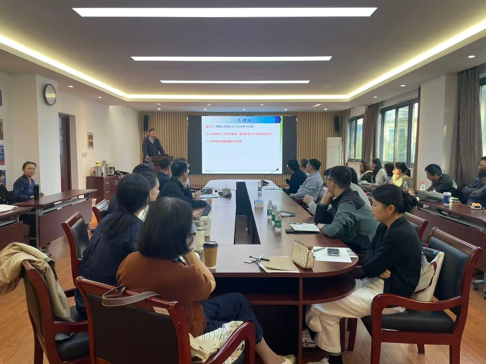 刘老师结合自己的申报经验,从学科发展和国家政策倾向等方面综合考虑,决定申报社科基金。对于申报书的撰写,刘老师建议老师们仔细研读申报“红宝书”,务必参照“红宝书”撰写申报书。刘老师在选题、申报书的研究基础、创新之处等部分给老师们提供了中肯、具体的建议。