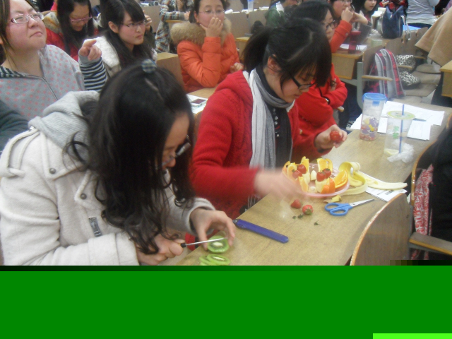比赛以班级团队为单位,竞争气氛愈演愈烈。在水果拼盘的比赛中,财管五班同学的“缤纷生活每一天”,其巧妙的构思和深刻的寓意获得评委们的大加赞许;“小熊的阳光春游”系列拼盘出自六班同学的巧手,它由三部分组成,用水果拼出小熊出游的场景,充满新意。在放松小游戏“爱的抱抱”后,迎来生活科学知识竞赛的紧张时刻,台上同学绞尽脑汁的答题,观众们也毫不放松的为他们出谋划策,现场气氛紧张而热烈。同学们均在此环节中受益匪浅,学到了许多实用的生活小知识。