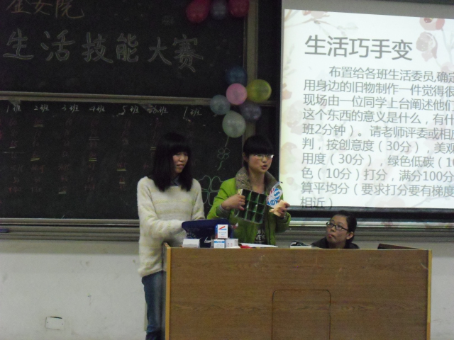 窗外华灯初上,进行了两个多小时的生活技能大赛在欢快的气氛下顺利落幕。2012级食品二班在激烈的角逐中拔得头筹。各个班级的精彩表现充分展示了班级出色的凝聚力和强烈的集体荣誉感。最后,冯老师为获奖班级体颁奖,并做了总结性讲话。女生节系列活动之生活技能大赛不仅以各种有趣的形式锻炼了大家的生活技能,更促进了自拍流出