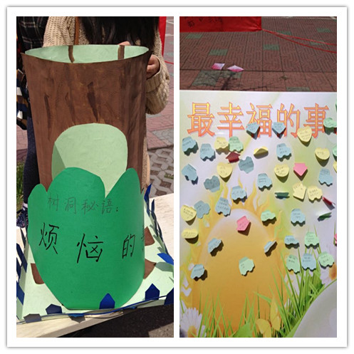 写着“烦恼的事”的树洞寓意着我们应给自己的心灵打开一扇明窗,把烦恼释放到窗外,随之呼吸进大自然的温暖。心站就是这样一个温暖的提供者,因为这样,同学们都毫无压力地向树洞诉说。他们是在释怀,也是在为我们心理气象站的工作提供素材。看到这样的场面,心站的我们不由觉得欣慰。