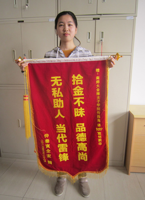 办公室里来了两位特殊的客人,他们手持情真意切的感谢信和写着“拾金不昧,品德高尚;无私助人,当代雷锋”的锦旗,执意要寻找一位名叫刘莉华的学生,向她致谢。