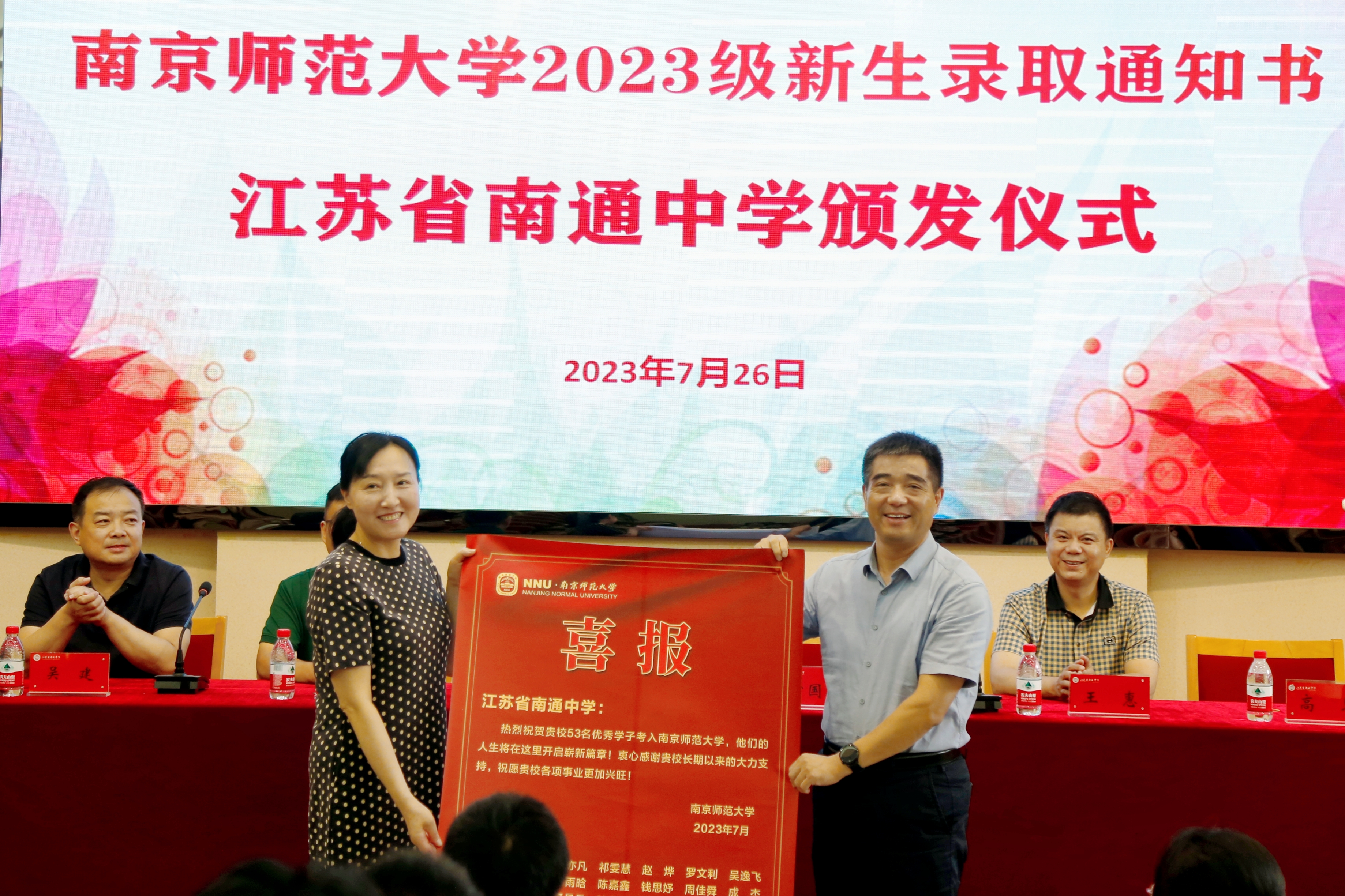 南京师范大学党委副书记贲国栋向南通中学校长陈建云赠送喜报并亲自为录取到南师大的新生颁发录取通知书。