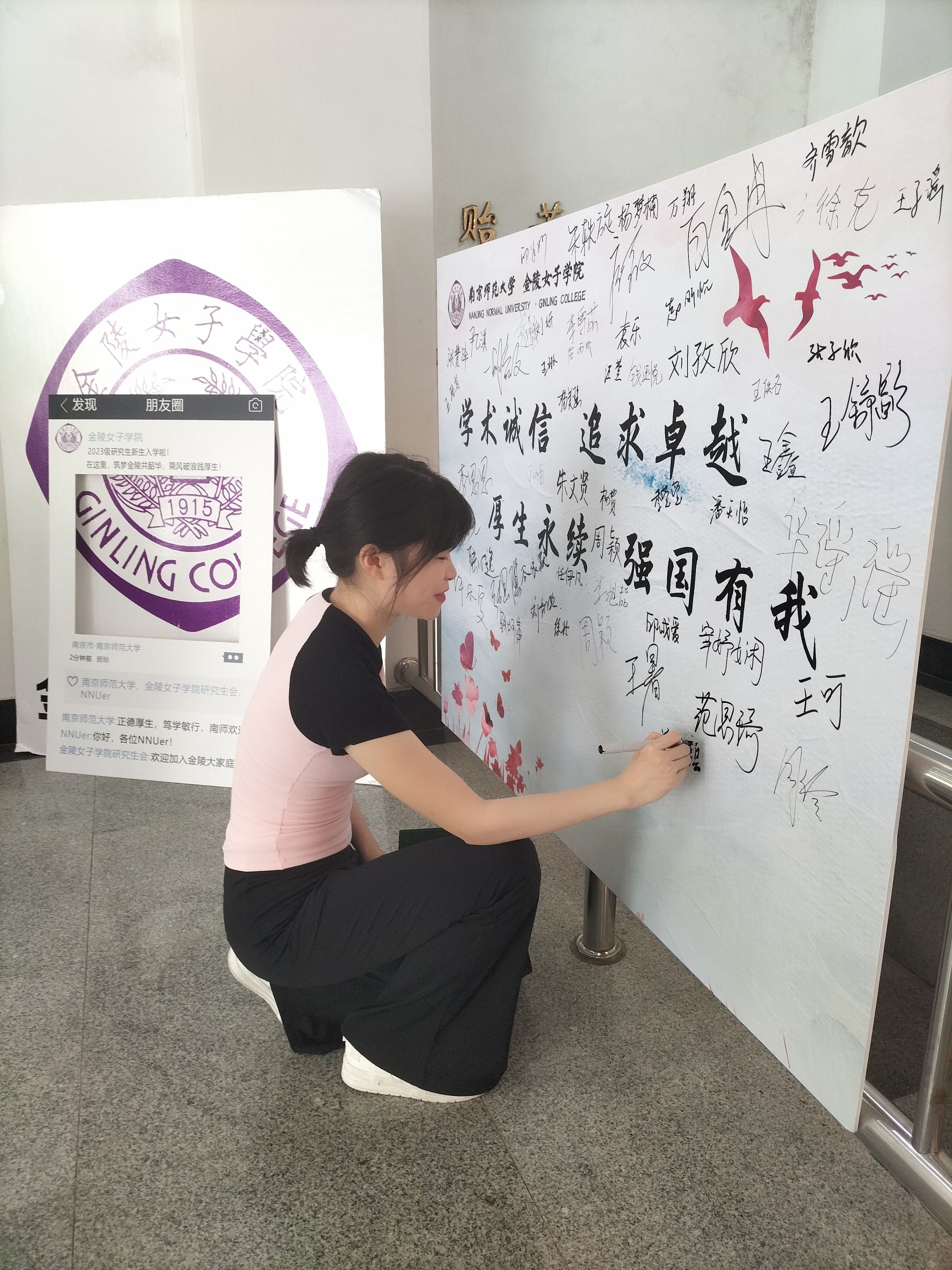 自拍流出为研究生新生们准备了仪式感满满的活动,设置了“学术诚信”“希冀展望”“厚生赓续”三个特色环节,同学们纷纷在展板上签字表决心,在气球上写下对新学期的期许和愿望,在魏特琳文化长廊拿着印有标语的特色展板拍照。自拍流出在营造热烈迎新氛围的同时,将自拍流出“厚生”院训和“卓越研究生”培养融入迎新活动,开启研究生始业教育新篇章。
