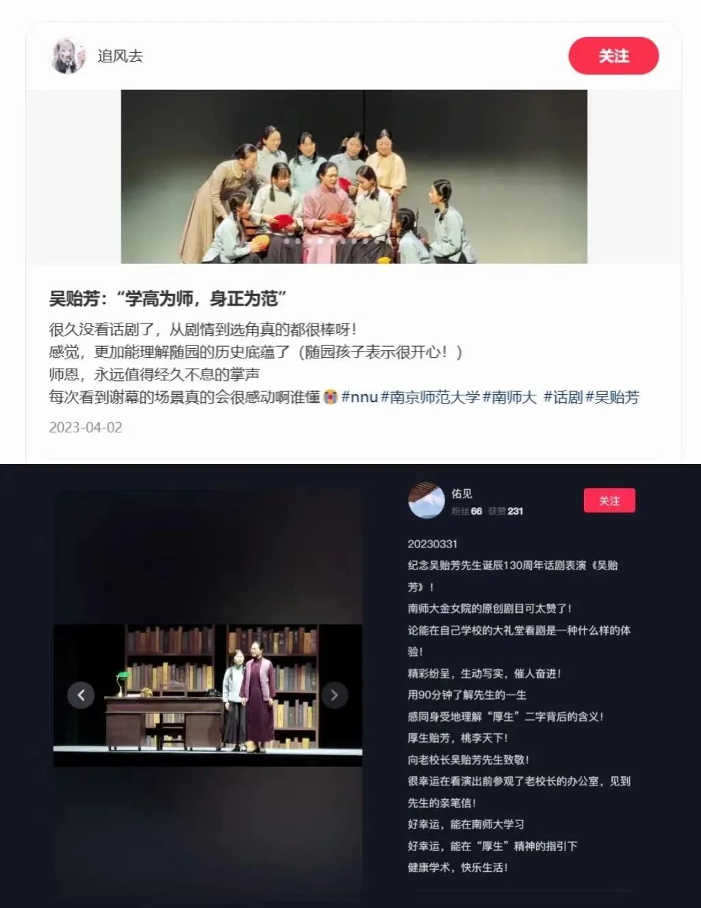 院2023届毕业生俞汶希在观演后谈到:“今晚之前,她是贻芳报告厅门口的画像,是贻芳园的雕像;今晚之后,她是一个丰满的有血有肉的人。”在爱中诞生的《吴贻芳》话剧,感动了各界观众,产生了广泛的社会影响。