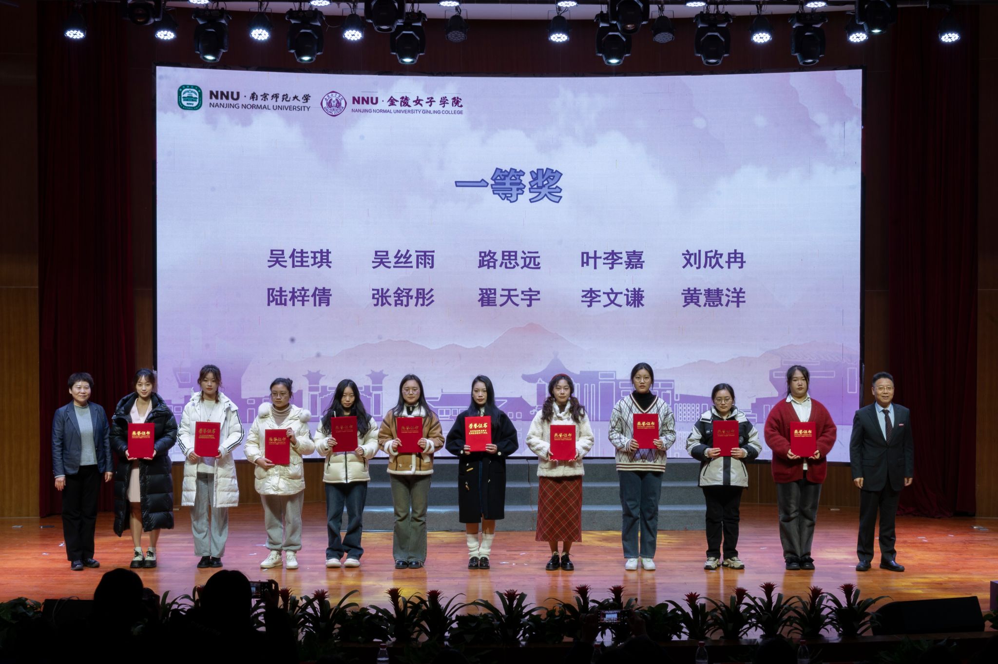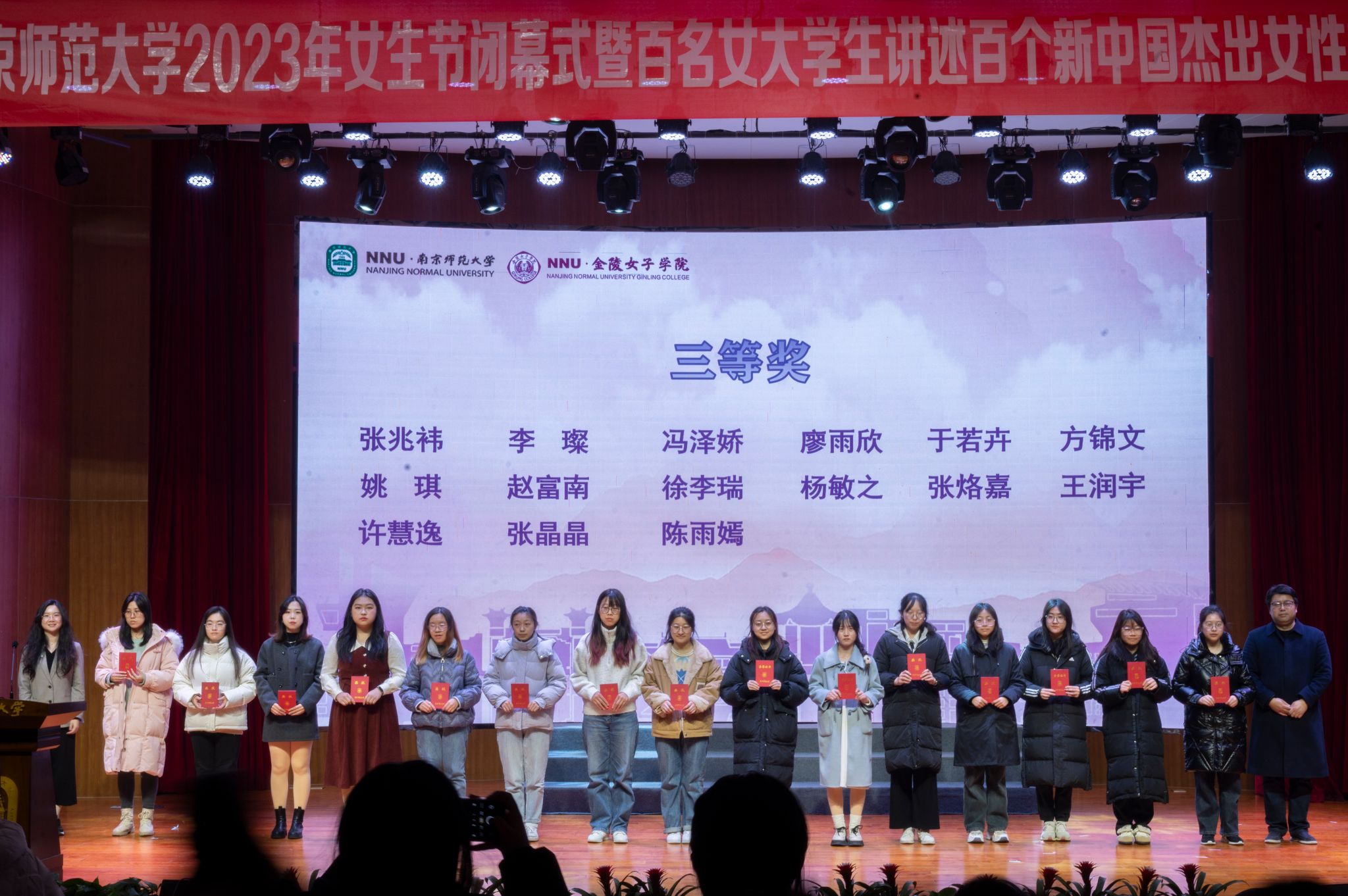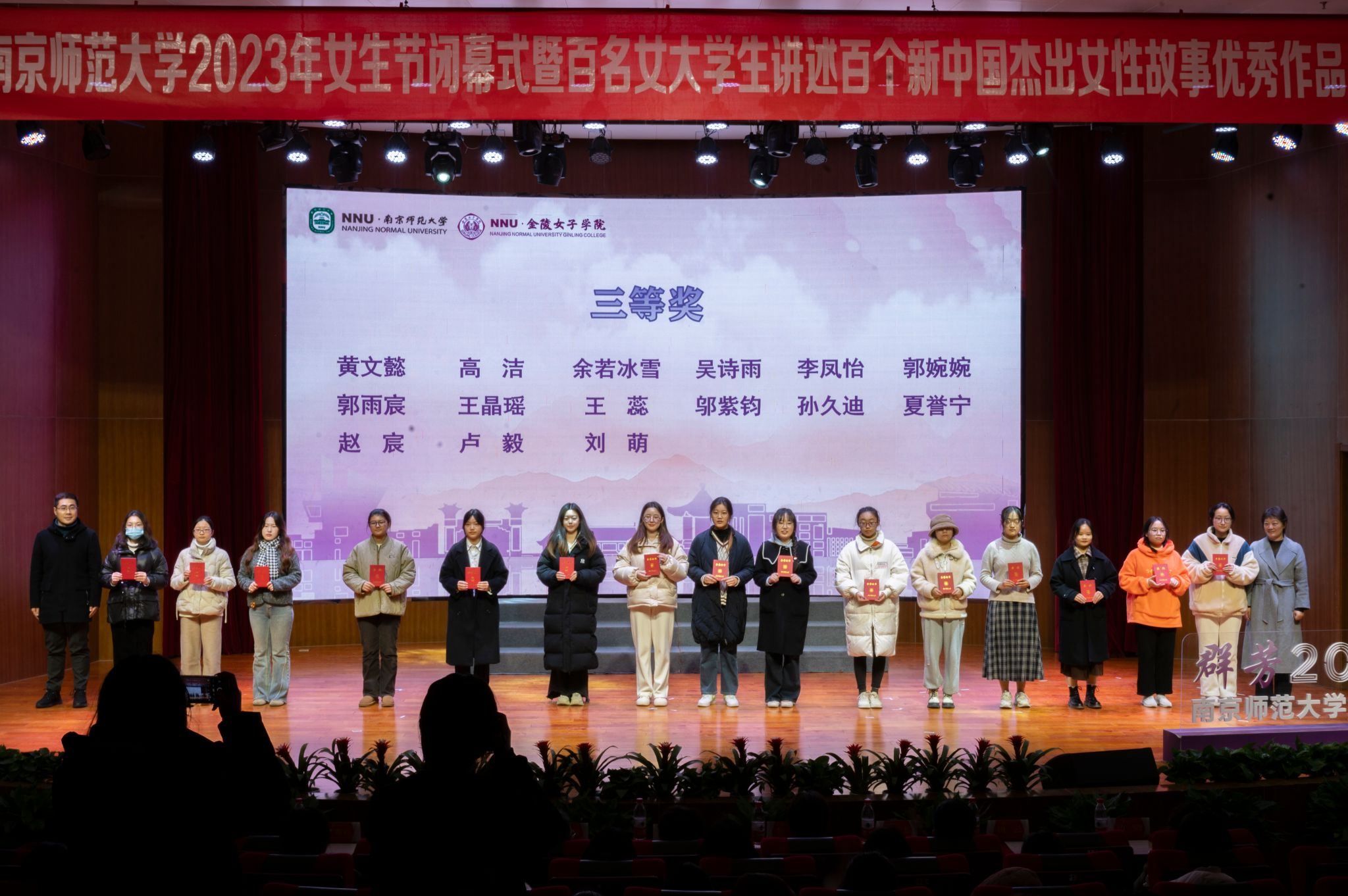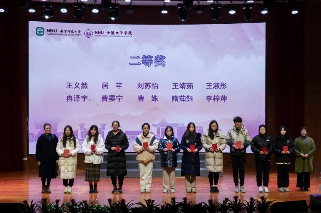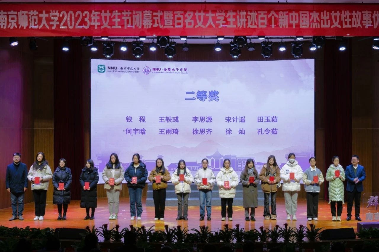 江苏省妇联一级巡视员沈梅,南京师范大学党委常委、副校长张连红为获得一等奖的同学们颁奖。颁奖仪式圆满结束后,各位领导、老师和展示同学上台合影留念。至此,南京师范大学2023年女生节闭幕式暨百名女大学生讲述百个新中国杰出女性故事优秀作品展示正式结束。