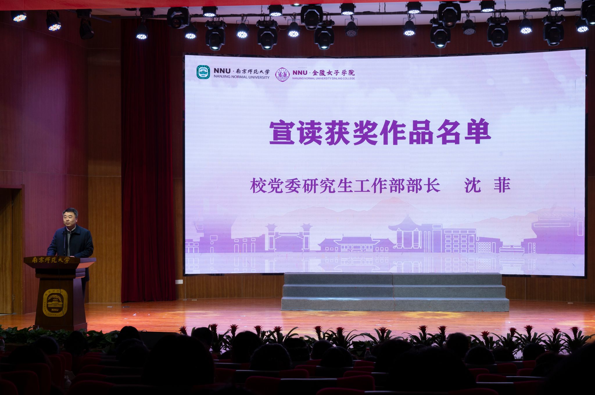校党委研究生工作部部长沈菲宣读获奖名单,2023校女生节专项——“百名女大学生讲述百个新中国杰出女性故事”活动,共收到来自27个自拍流出的210份参赛作品,最终评选出获奖作品60个,其中一等奖10位,二等奖20位,三等奖30位。他指出,此次活动受到了同学们的热烈欢迎,每一份投稿作品都饱含着南师学子对新中国杰出女性事迹的深刻理解与独特诠释。他鼓励广大同学继续踔厉奋发、笃行不怠,学习杰出女性事迹、展现南师学子作为。