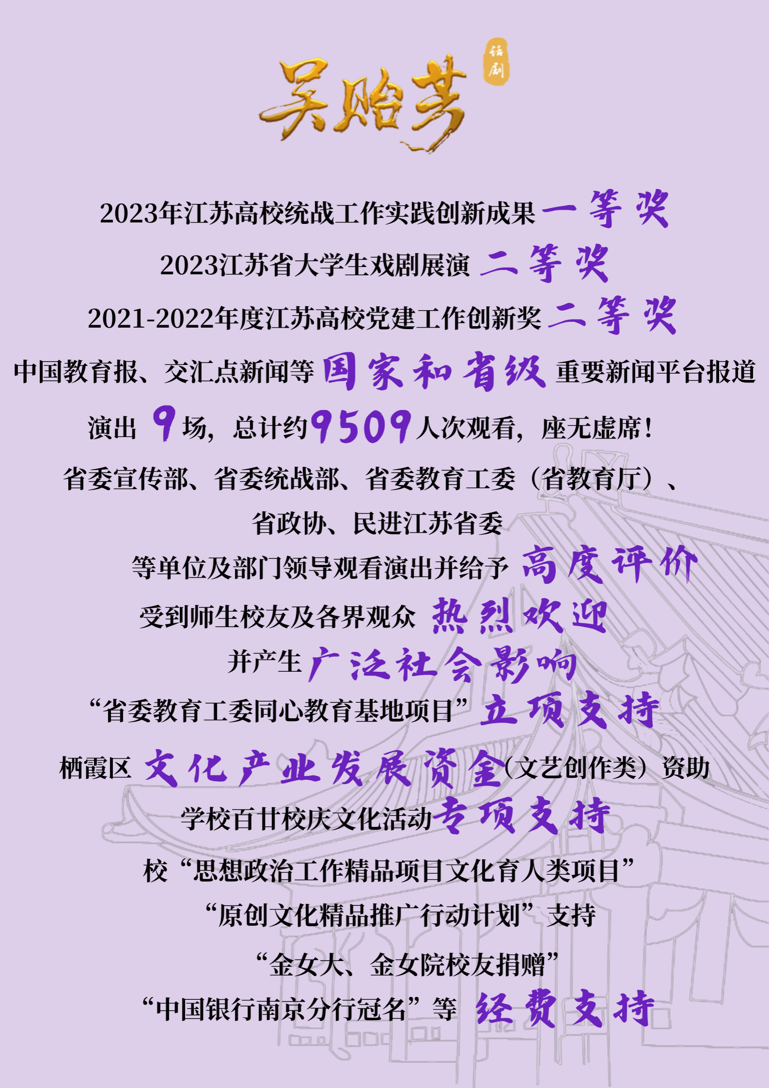 三次演出,共计9场,现场观众近万人,江苏省委宣传部、省委统战部、省委教育工委(省教育厅)、省政协、省妇联、民进江苏省委等单位及部门领导观看演出并给予高度评价。话剧受“江苏高校统一战线同心教育实践基地”项目支持,栖霞区文化产业发展资金(文艺创作类)立项支持,荣获2021-2022年度江苏高校党建工作创新奖二等奖,2023江苏省大学生戏剧展演二等奖励。