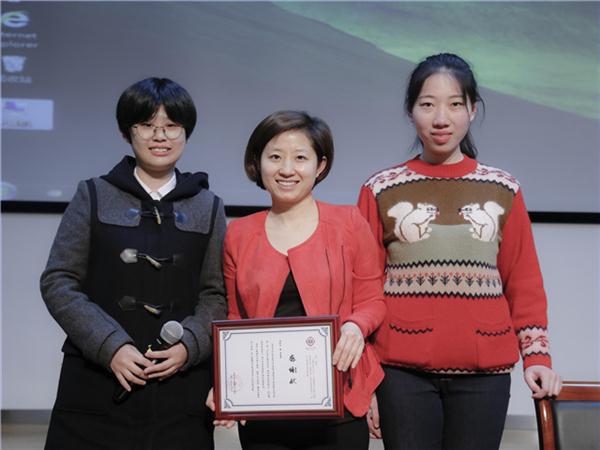志愿者为侯贞老师颁发感谢状,感谢侯老师为同学们带来的精彩讲座,同时感谢侯老师对“女大学生素质证书”项目的支持与贡献。