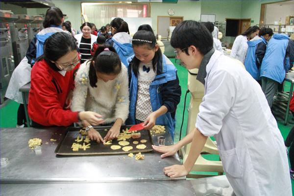 院食品系刘琛、孔晓雪老师讲解制作饼干的程序及使用的先进仪器,个个摩拳擦掌,跃跃欲试。讲解结束,女童们开始制作期待已久的蔓越莓饼干。她们在志愿者的带领下完成了制作面团的准备工作,又利用各式各样的模具,展现出了属于儿童的创造力与想象力,她们认真地按压面团,捏出形状:心形的、字母的、圣诞树的……不一会儿,成型的饼干便摆满了整个烤盘。随着饼干们被放进烤箱烘焙,整个烘焙中心都充溢着饼干香甜的味道。饼干出炉时,女童们一片欢呼,迫不及待地品尝自己精心制作的饼干,也与小伙伴们和志愿者姐姐分享着各自的美食,其乐融融。