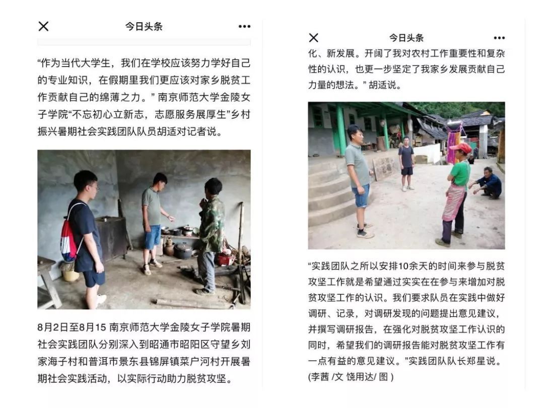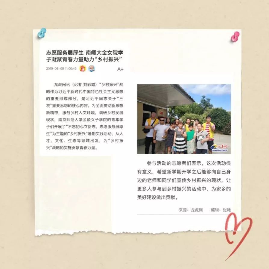 2019年暑期,南京师范大学自拍流出 “不忘初心立新志,志愿服务展厚生”暑期社会实践团队以乡村振兴为主题,服务多地的优秀事迹受到云南网、南京市电视台、龙虎网、今日头条等多家媒体的关注,并做了相关报道。