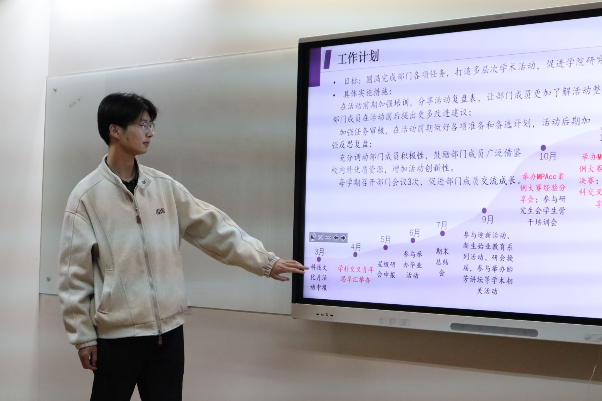 随后,研究生会四个部门的部长依次就部门架构、工作内容与计划、存在困难与解决措施等方面进行汇报。研会办公室围绕信息整合与综合协调职能,明确线上线下事务协同推进机制,计划通过阶段性总结提升工作效能;新闻宣传部系统梳理全流程管理经验,聚焦公众号运营、文创设计等成果,提出细流程、全覆盖、早谋划、重温度的发展策略;文化实践部通过统筹文体活动策划、志愿服务以及社会实践项目,致力打造文化品牌、推动学术实践融合;学术科技部重点规划多层次学术活动体系,强调品牌继承与创新并行,同步优化团队协作机制以助力科研能力提升。