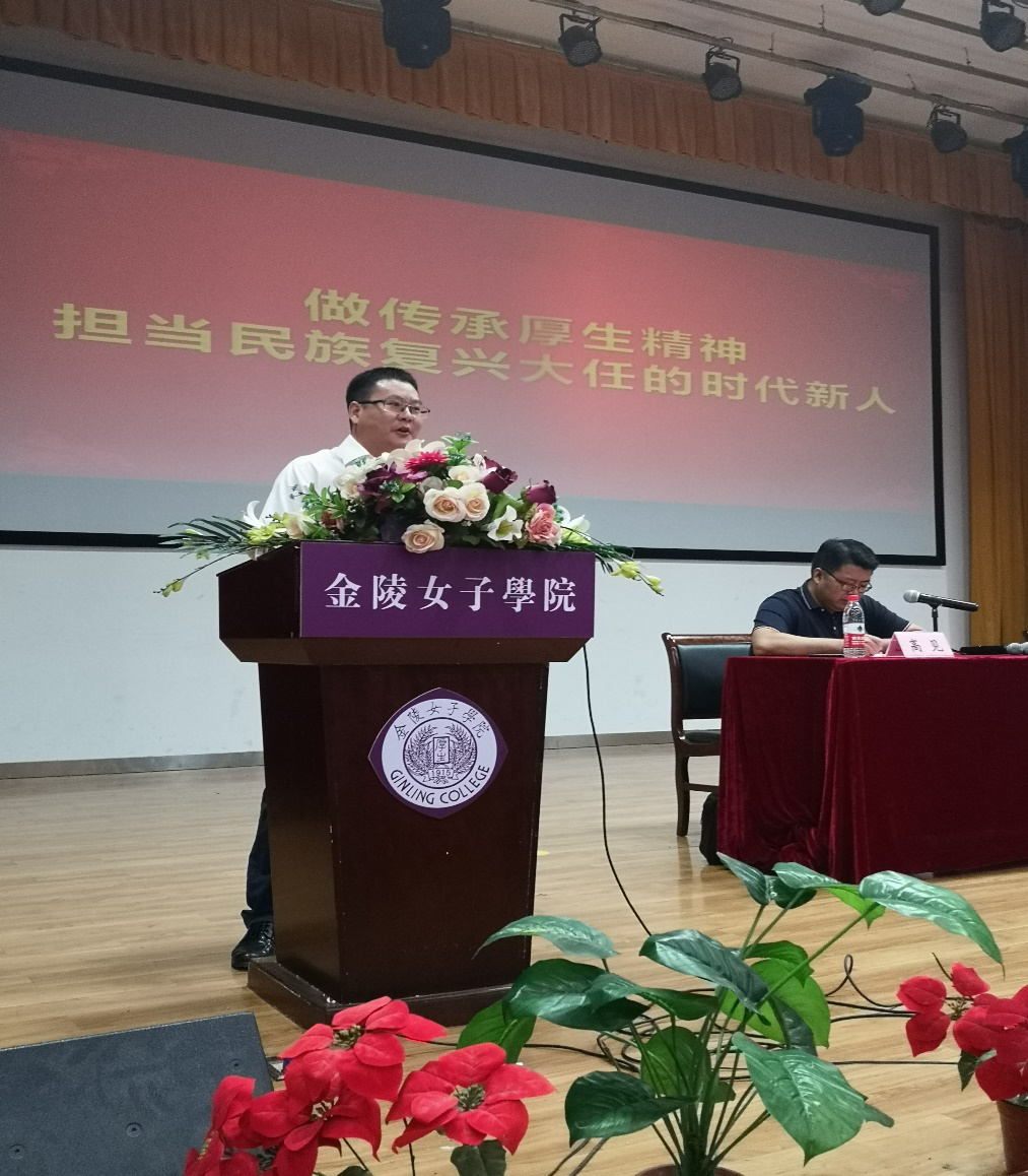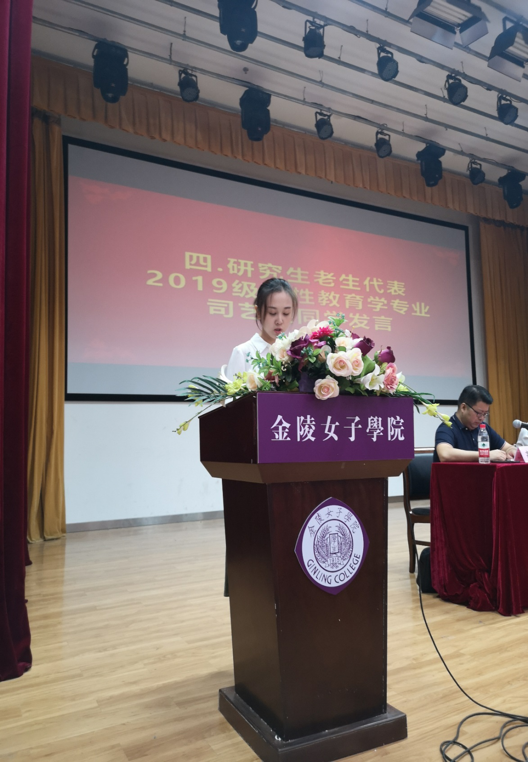 随后,老生代表2019级女性教育学专业司艺旋同学上台发言。她分享了自己读研以来的心路历程与成长经历,鼓励同学们克服困难、坚持不懈、持之以恒。她通过回顾社会各界众志成城抗击新冠肺炎的历程,砥砺新生传承厚生精神,以自己的智慧和力量造福社会。