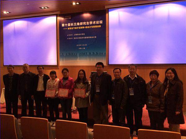 11月12日,在会计系的精心组织下,由柏檀老师带队的3名新入学研究生参加在上海同济大学召开第10届长三角研究生学术论坛。长三角学术论坛是江浙沪地区最为活跃与高级别的学术组织,成员包括复旦大学、上海交通大学、浙江大学、同济大学、上海财经大学等著名院校,涵盖了长三角地区所有会计学科研究生培养单位,旨在为会计学科的研究生提供良好的学术交流平台。我校会计系首次参会,并取得1名2等奖、2名3等奖,相应地指导教师也获得优秀指导教师奖项。