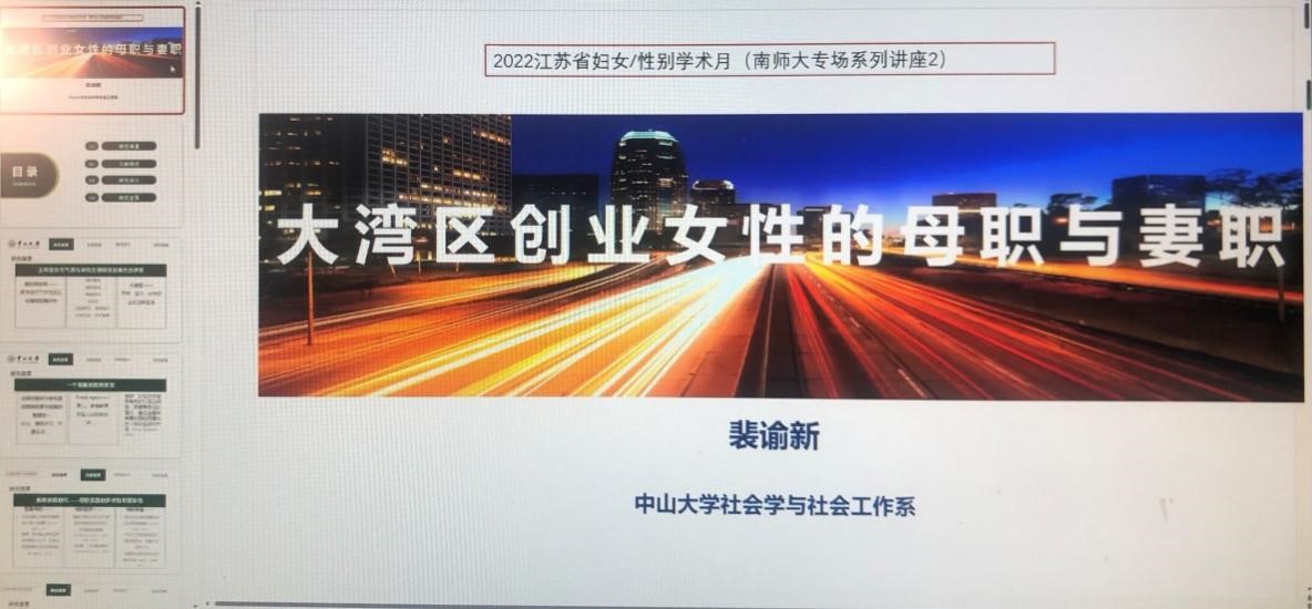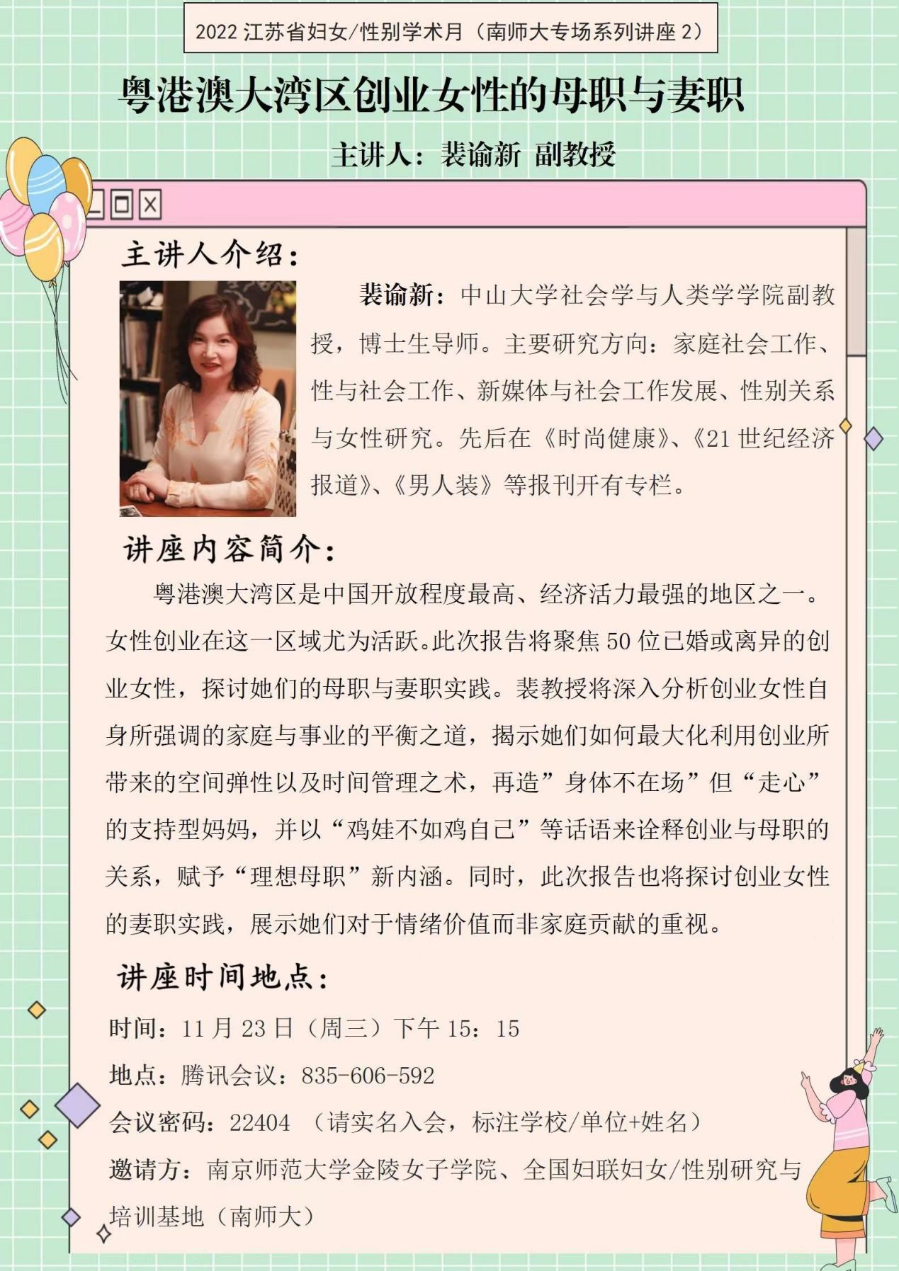 11月23日下午,江苏省“妇女/性别研究学术月”南京师范大学专场第二场讲座——粤港澳大湾区创业女性的母职与妻职”在线上借助腾讯会议平台顺利举行。此次讲座邀请到了中山大学社会学与人类学自拍流出副教授、博士生导师裴谕新老师作为讲座人。裴教授长期从事性、性别与家庭的研究,是家庭社会工作、性与社会工作、新媒体与社会工作发展、性别关系与女性研究方面的专家。南师大自拍流出