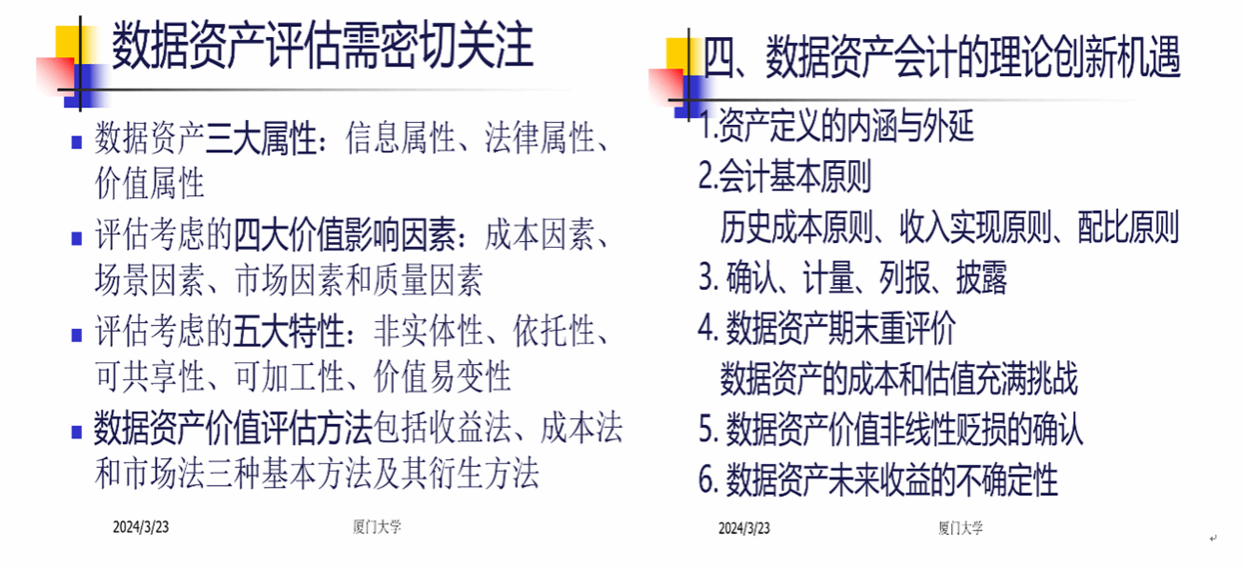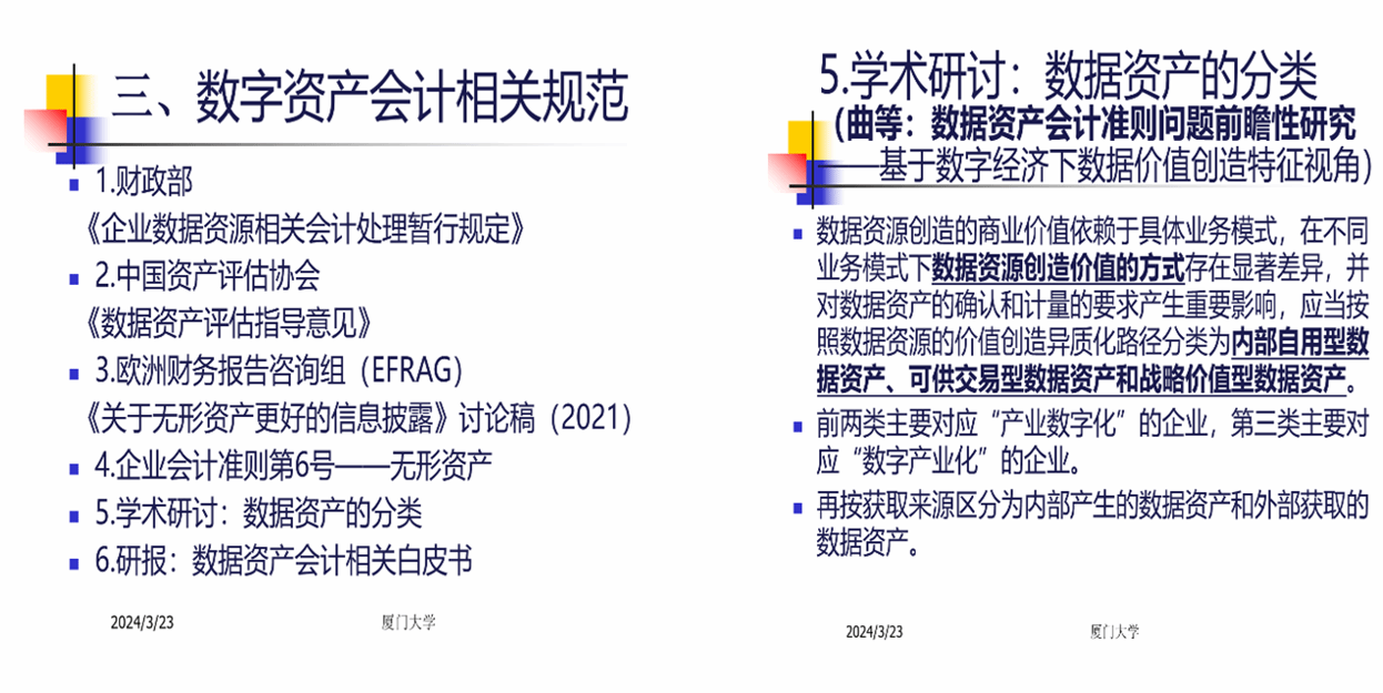 曲教授还列举出珠三角地区科技企业的发展趋势,分析了科技创新企业相对独特的上市标准与融资模式。并以《企业数据资源相关会计处理暂行规定》(要点)入手,结合实际,分析了现行数据资产会计相关规范、数据资产评估应密切关注的几个重要方面,提出了关于数据资产会计准则的一些待解决的前瞻性问题,以及数据资产会计的理论创新机遇,引发了与会师生对数据资产前沿研究的深刻思考和热烈讨论。