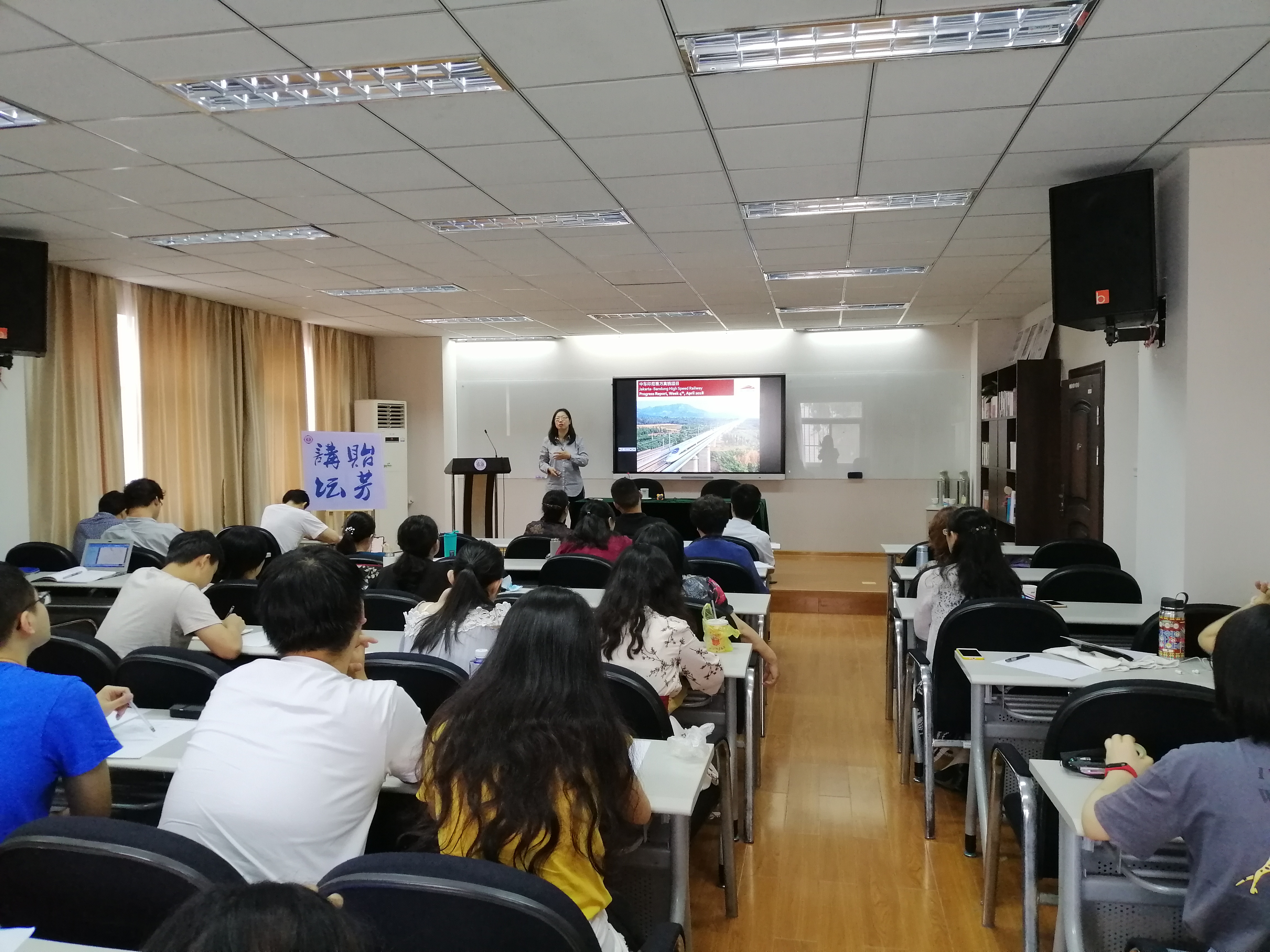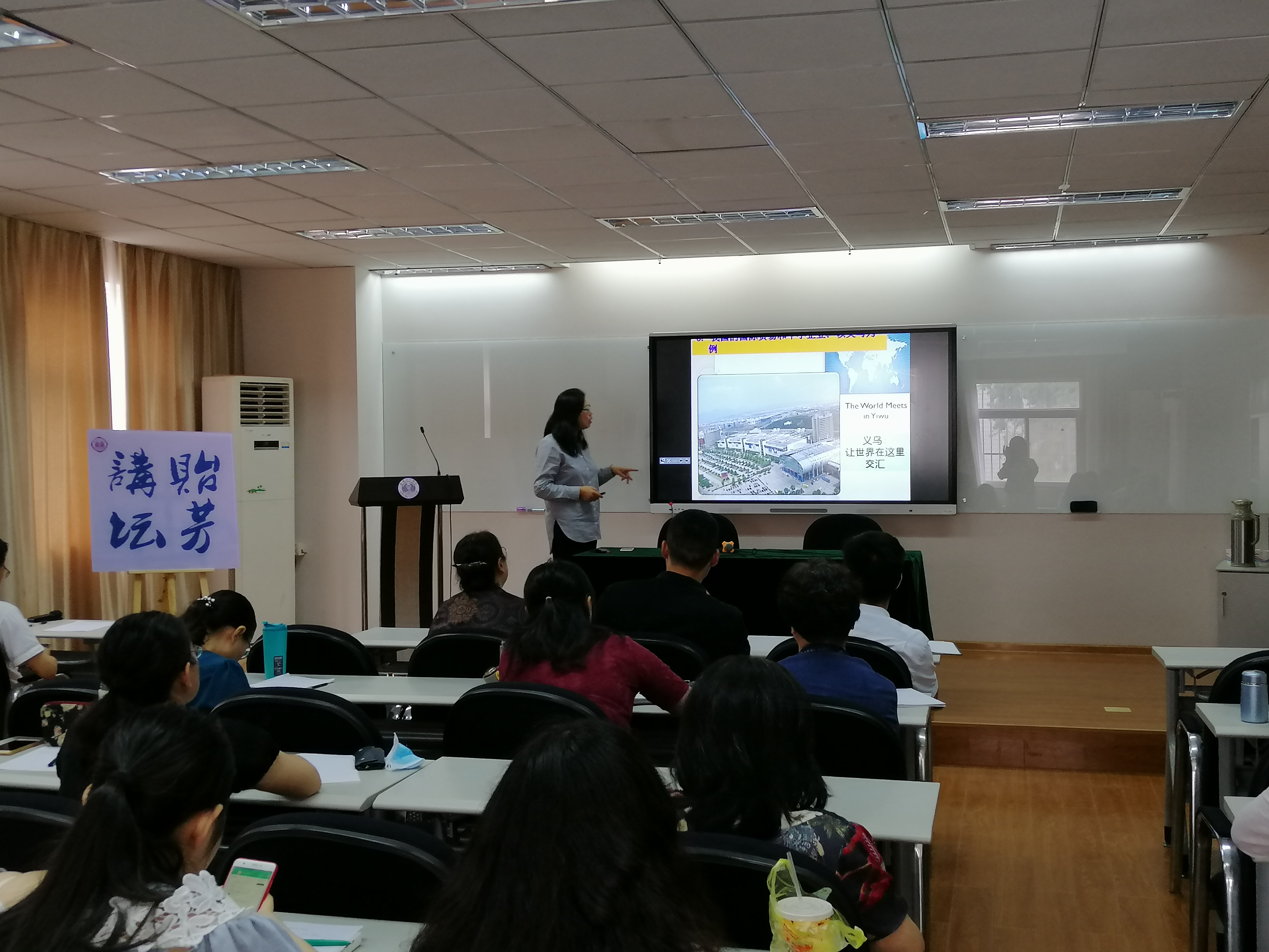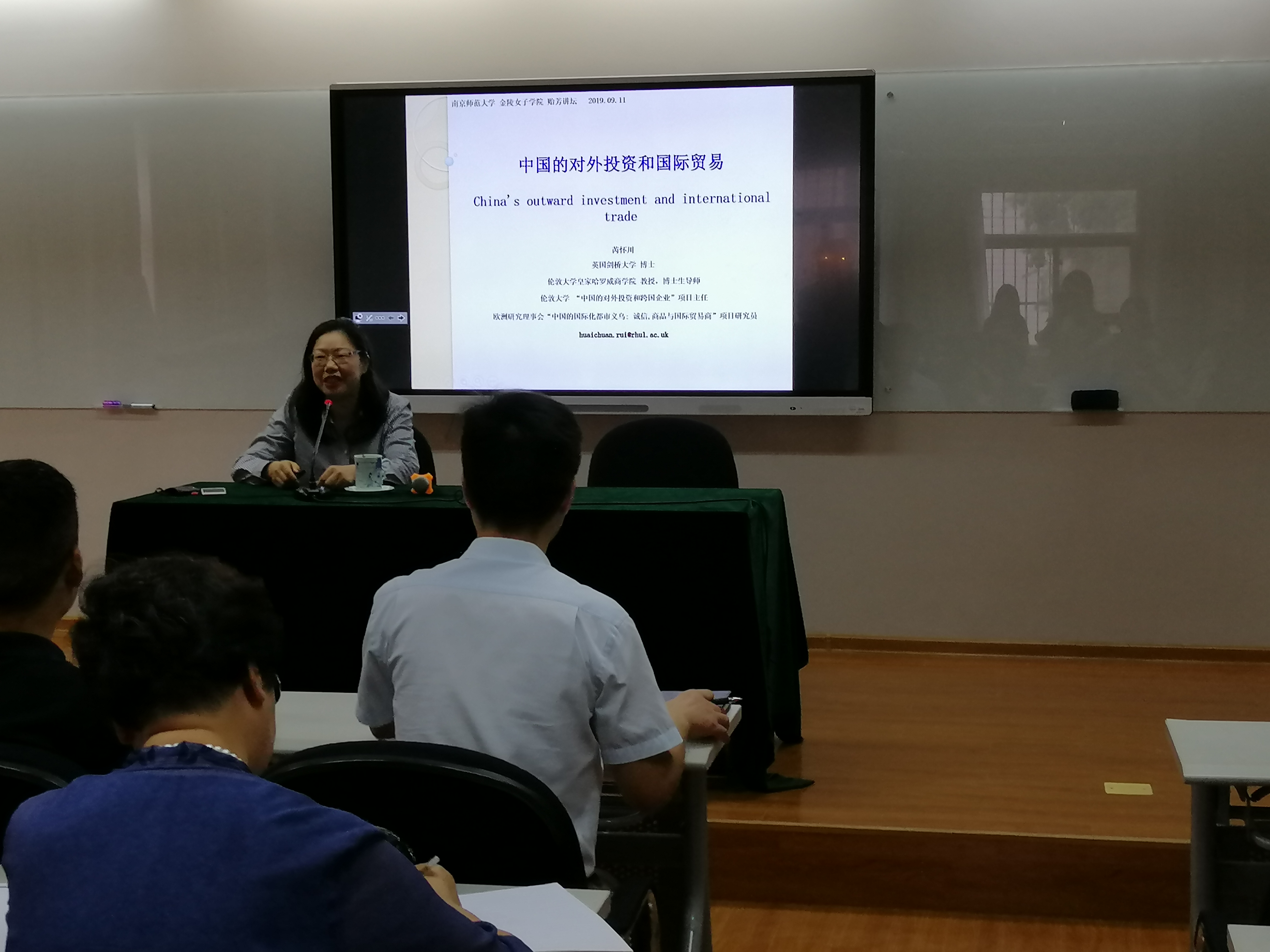 芮怀川教授带来了主题为“中国的对外投资和国际贸易”的学术报告。首先,她向与会的教师和学生阐明了自身研究动机和方法,即“学以致用、实事求是”。