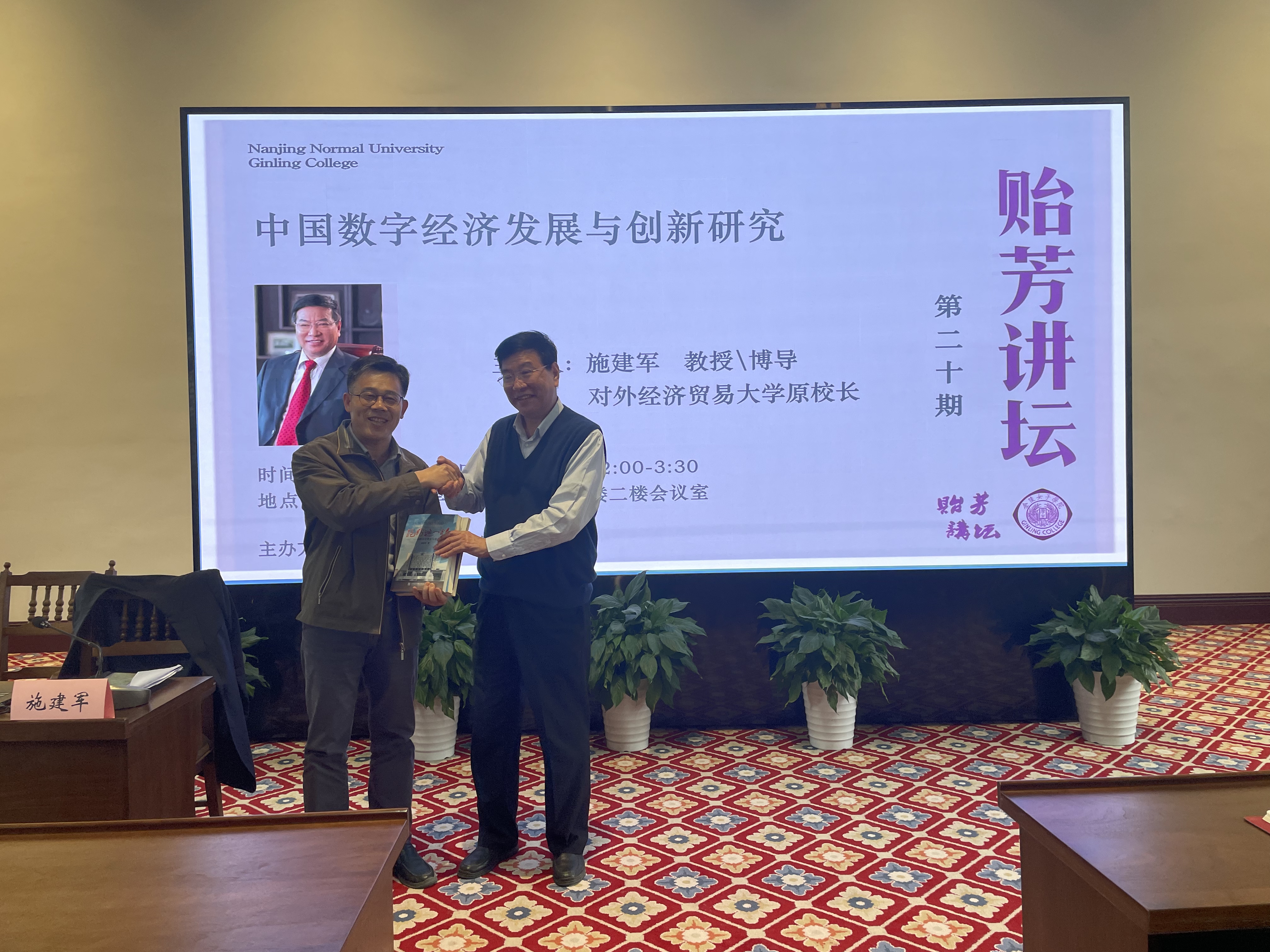 施建军教授除了带来精彩的学术报告,还带来了他出版的关于管理创新、服务外包企业创新以及关于办学理念与思考的多本著作,南京师范大学党委常委、总会计师任雷鸣代表学校接受了施教授的赠书。讲座在参会师生的热烈掌声中圆满结束。