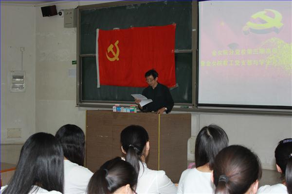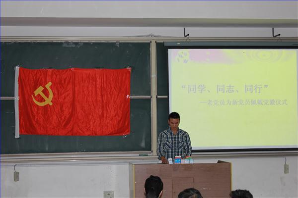 党委副书记杨素萍老师领誓下,大家郑重地举起右手,洪亮而整齐地诵念庄严的入党誓词,教室上空弥漫着广大师生党员激情澎湃的誓言。随后,教师党员为刚发展的新党员代表佩戴了鲜红的党徽,愿共产党员的精神代代相传。