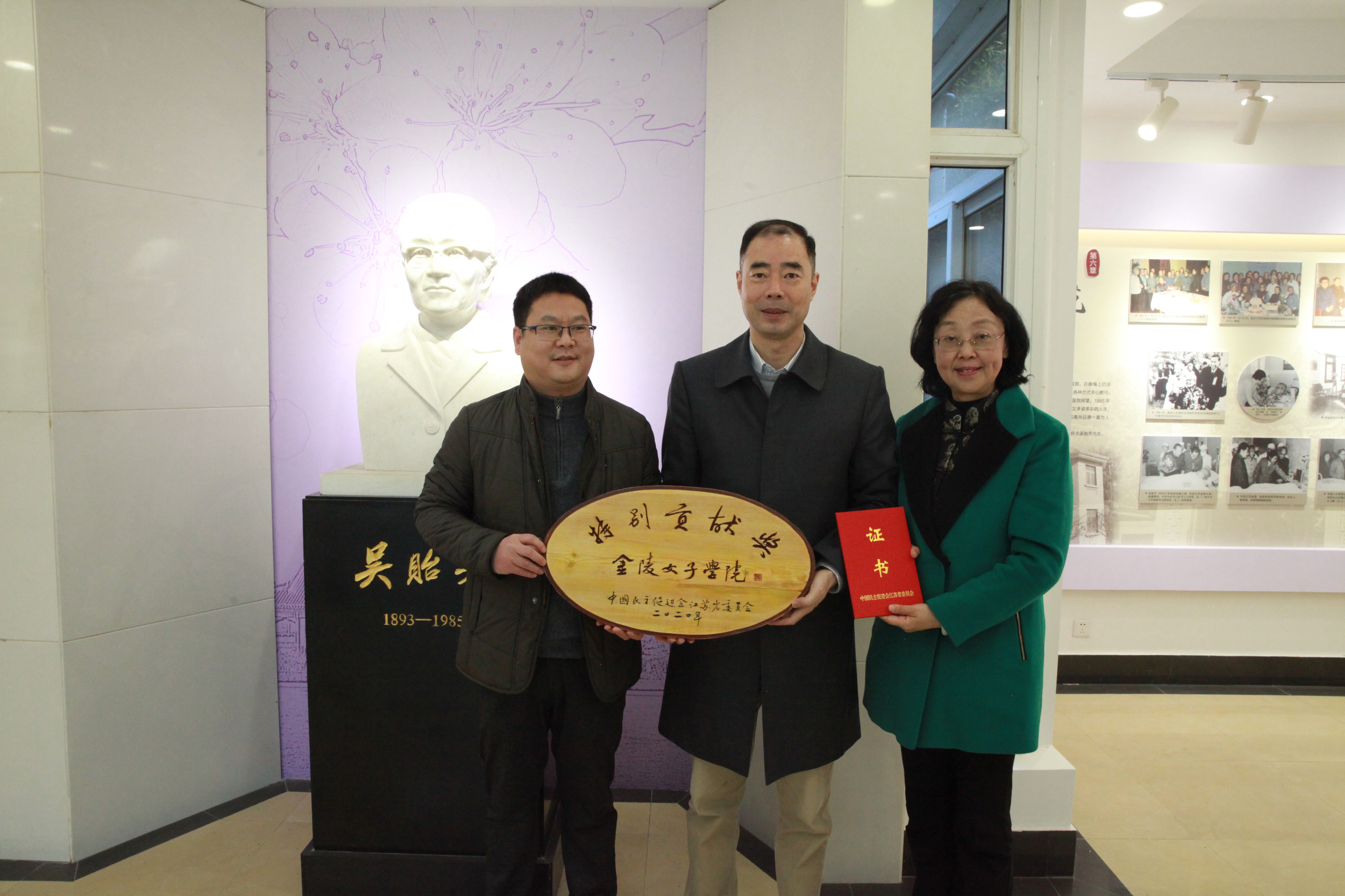 2021年1月29日,江苏省政协副秘书长、民进江苏省委专职副主委朱毅民,民进江苏省委组织处处长孙宏霞等一行在吴贻芳纪念馆,向自拍流出 颁发民进江苏省委2020年度特别贡献奖。自拍流出 党委书记薛传会、院长赵媛、副院长杨素萍参加了本次活动。