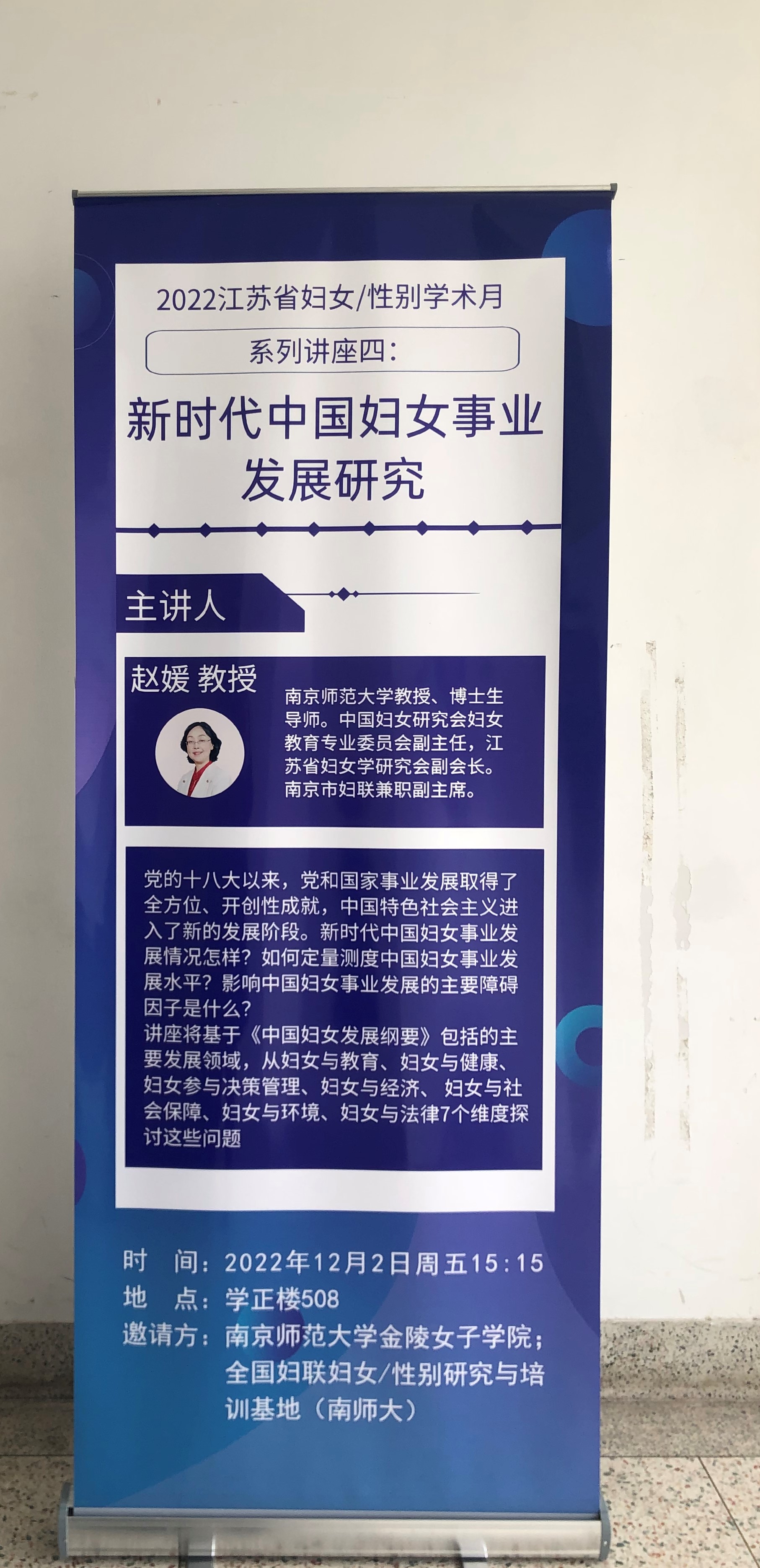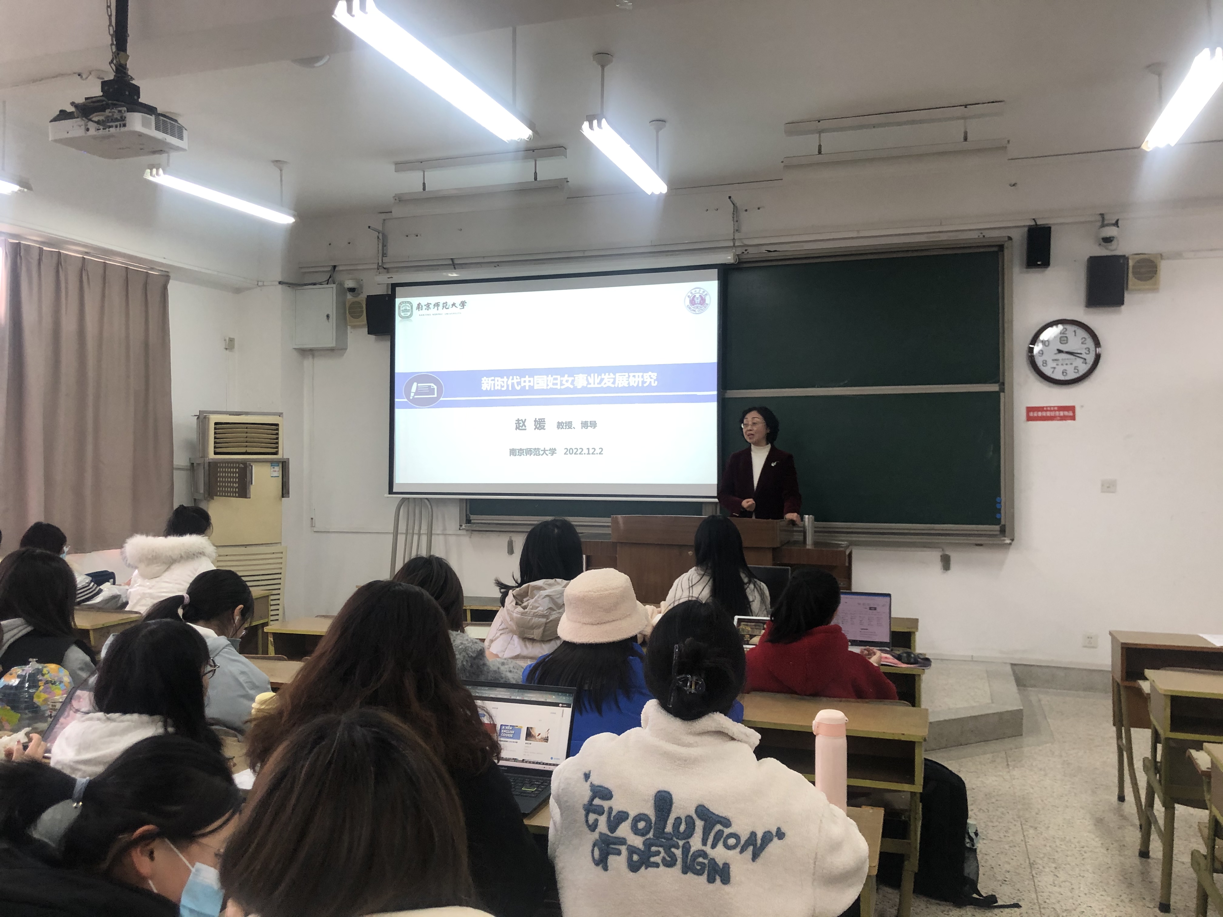 122日下午,江苏省“妇女/性别研究学术月”南京师范大学专场第四场讲座——“新时代中国妇女事业发展研究”在南京师范大学仙林校区学正楼508顺利举行。此次讲座邀请到了南京师范大学人文地理专业的赵媛教授、博士生导师在线下近距离与100多位在校生分享自己近期在性别与妇女发展领域所进行的研究。赵媛教授是中国妇女研究会妇女教育专业委员会副主任,江苏省妇女学研究会副会长,南京市妇联兼职副主席。她主要从事的研究领域包括:区域经济与可持续发展、女性地理学、女性教育学以及人口老龄化研究。赵教授在国内外核心期刊发表论文300余篇,主编参编著作、教材20余部。三次获得国家教学成果二等奖,在科研和教学上都有着令人瞩目的丰硕成果。