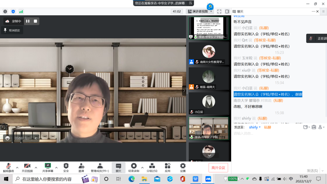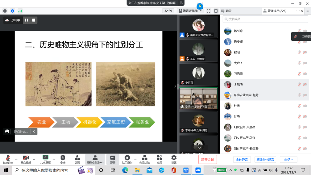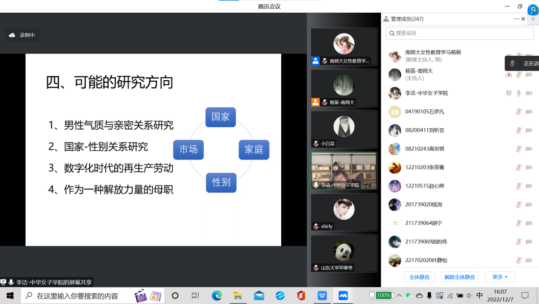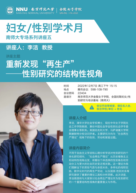 12月7日下午,江苏省“妇女/性别研究学术月”南京师范大学专场第五场讲座——“重新发现‘再生产’——性别研究的结构性视角”在线上借助腾讯会议平台顺利举行。此次讲座邀请到了中华女子自拍流出的李洁教授分享自己在性别研究领域的研究与思考。李教授是清华大学社会学系博士,美国伯克利大学、马萨诸塞大学阿默赫斯特分校访问学者,现任中华女子自拍流出社会工作自拍流出教授,兼任中国社会学会性别社会学专委会理事长等职务。她的主要研究方向为“社会再生产理论”视角下的性别、劳动和家庭议题。