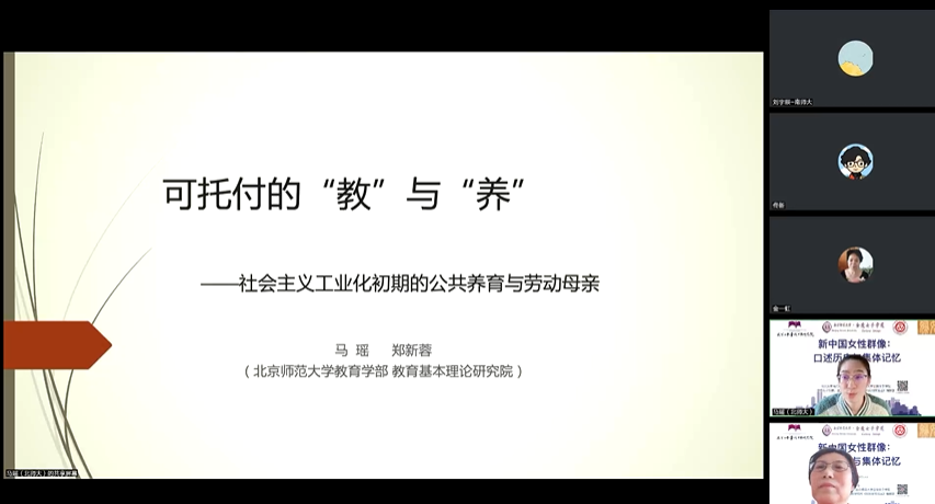 下午开始的第三单元由北京师范大学教育部博士马瑶分享了其与导师郑新蓉共同研究的成果“可托付的‘教’与‘养’——社会主义工业化初期的公共教养空间与劳动母亲”。报告揭示了社会主义工业化初期“公共教养空间”的生成——国营企业如何借助工厂子弟校、托儿所等教养场所,依靠从养到教整个过程中的“可托付性”,培养了富有活力的丰富教养主体、重塑了劳动母亲的主体身份。同时也最大程度上承载了工厂的再生产职能的基础上发展工业生产,为新生的社会主义国家工业化提供了强有力的支持。正如主持人中华女院的张李玺教授所指出的,这种集体共享与公共教养空间的形成也会对我国现今推行“三胎政策”提供有益的启迪,可发展为当前社会知识网络的共享。