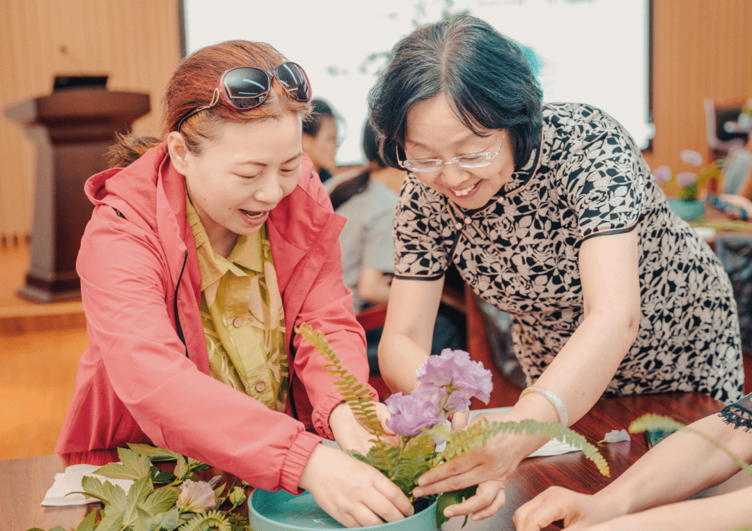 在花道体验环节,董老师不仅指导大家亲手尝试插花,还鼓励大家静心感受花卉与心灵的和谐对话。花道既是一种服务于家庭与社会的生活技艺,也是插花人雅养身心的一种修行方式。花道的精髓就是通过线条、颜色、形态和质感的和谐统一来追求“静、雅、美、真、和”的意境。