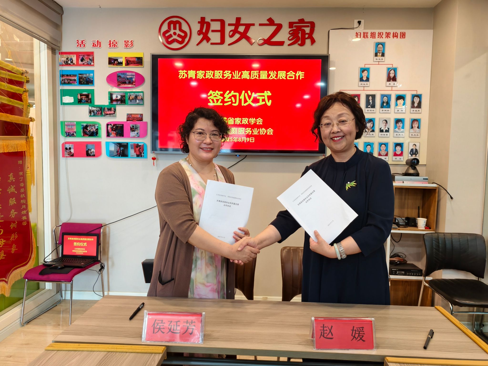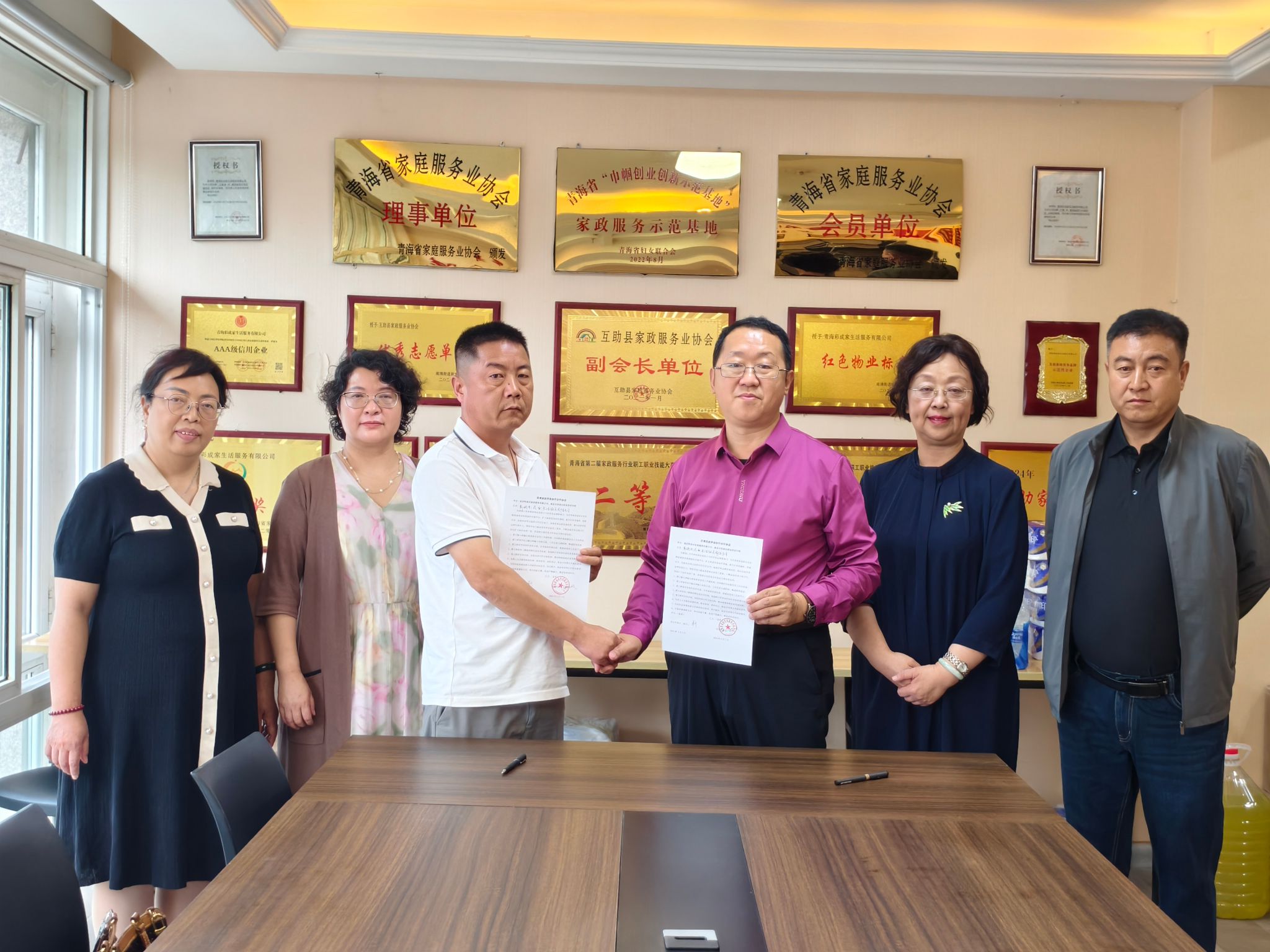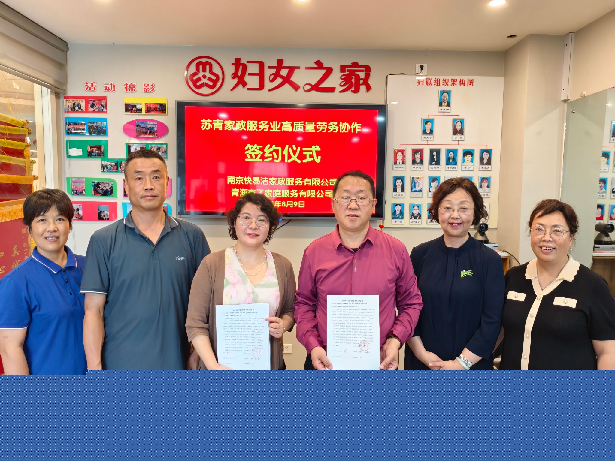 江苏省家政学会理事长赵媛与青海省家庭服务业协会会长侯延芳签订了《苏青家政服务业高质量发展合作协议》,南京市快易洁职业培训学校校长夏宁与西宁夏都家匠职业技能培训学校校长侯延芳签订培训合作协议,南京快易洁家政集团总经理夏宁分别与青海有了家庭服务有限公司、青海彩成家生活服务有限公司签订了劳务合作协议。