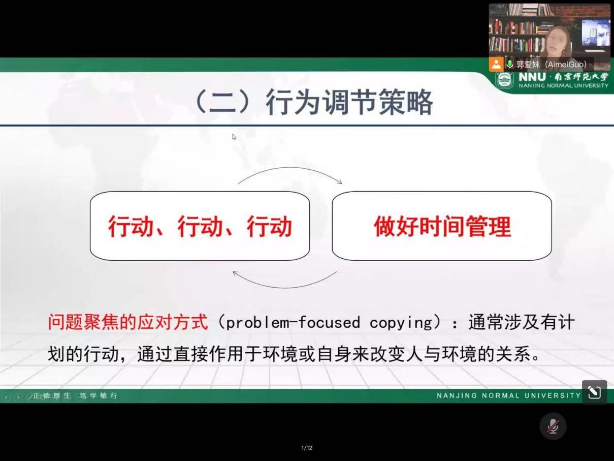 其次,在行为调节策略方面,郭爱妹教授提出,与其整天生活在焦虑之中,不如马上行动。在不可控、不确定性的环境中,有条不紊、井然有序的学习与生活,能够有效提升同学们对生活的掌控感,增加确定性,努力赋予时光和经历以意义。