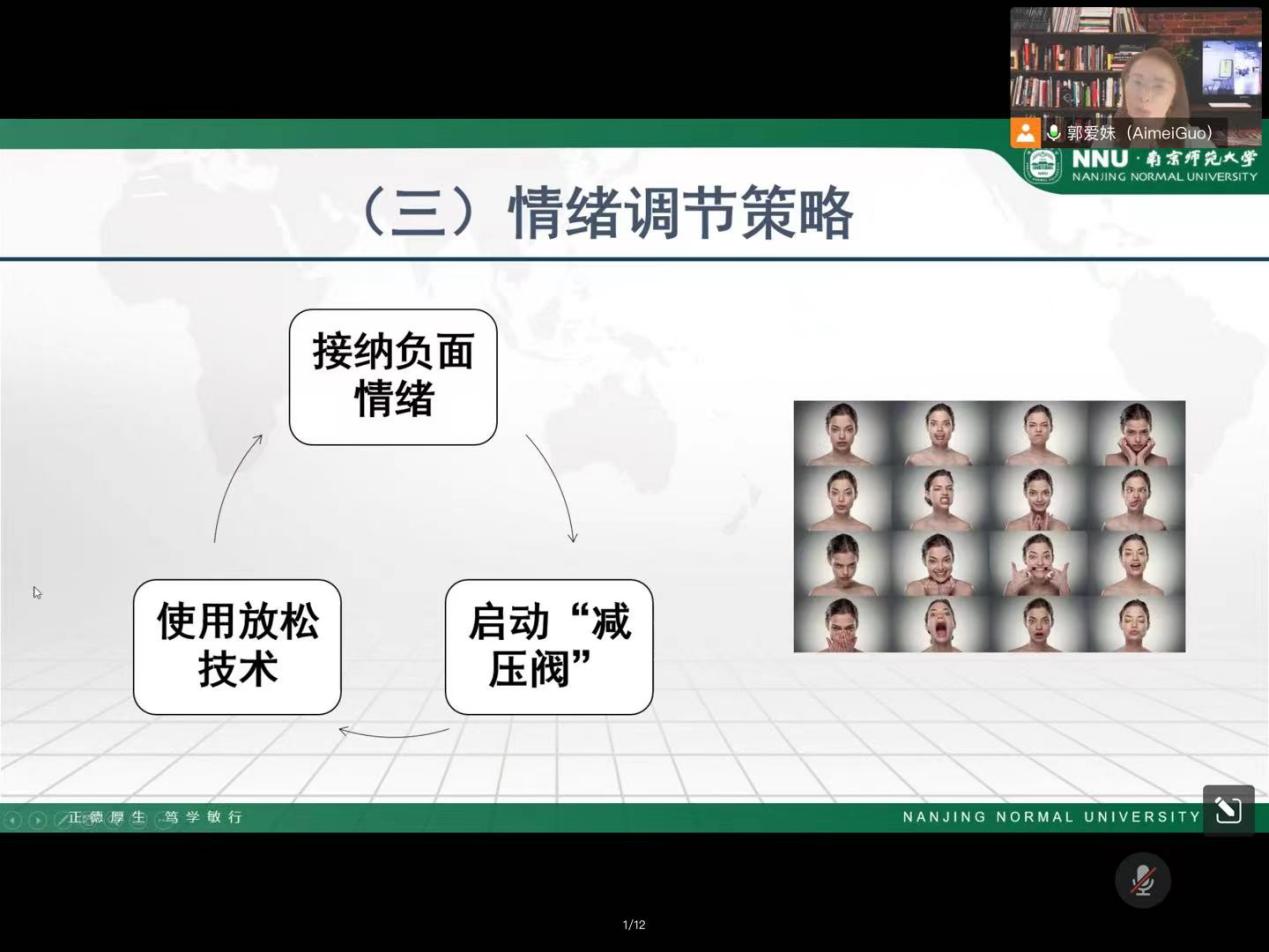 最后,郭爱妹教授认为,疫情所带来的负面情绪是一种正常的心理应激反应。在情绪调节策略方面,同学们不仅要学会接纳和理解自己的负面情绪,更要努力学习各种有效的减压方法,找到适合自己的“减压阀”或放松技术,合理释放负面情绪,缓解负面情绪带来的困扰。