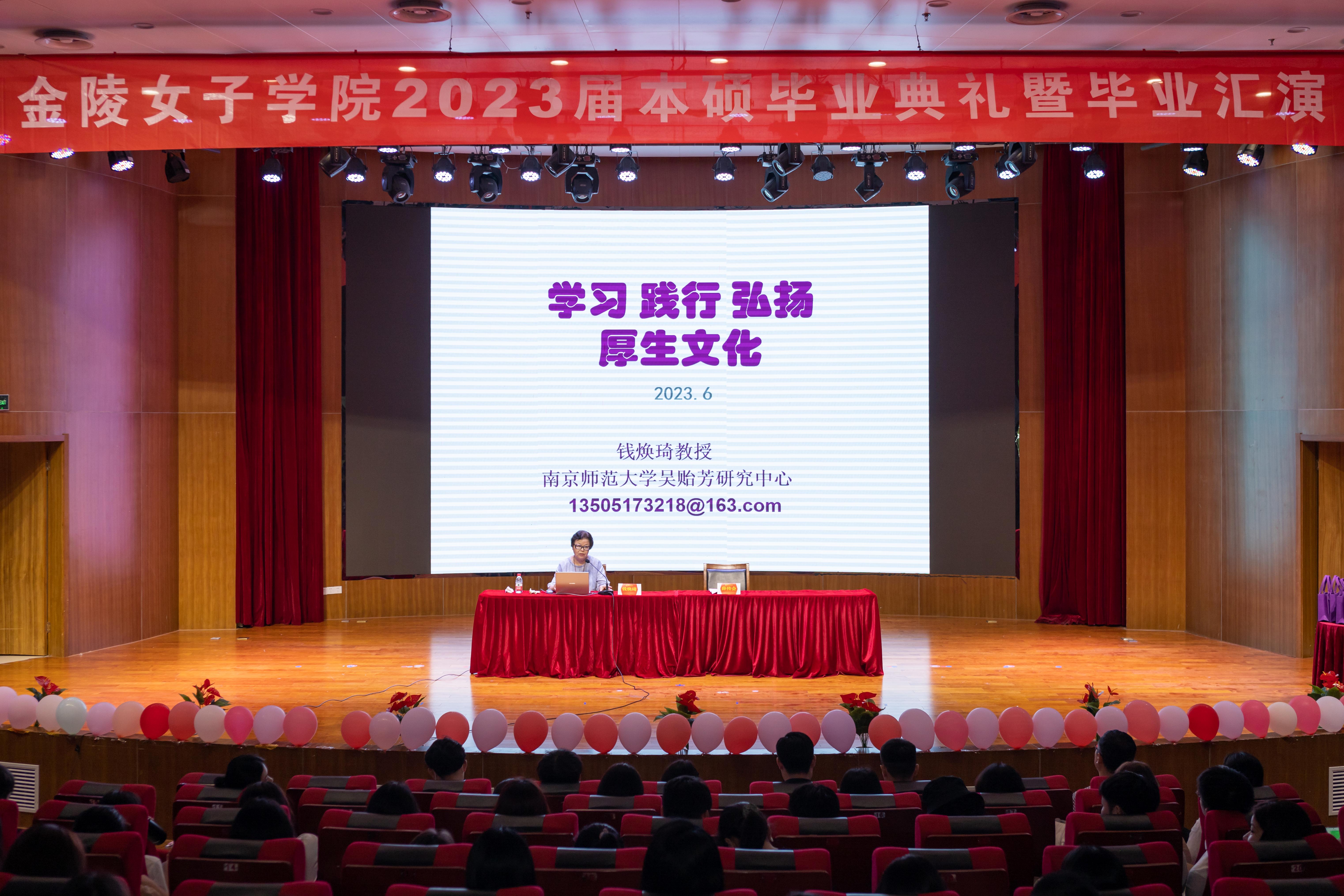 、吴贻芳老校长和金陵儿女们的全景展现。今年是吴贻芳校长诞辰130周年,钱老师也着重讲了吴贻芳校长的人生故事,正如我们师生排演的《吴贻芳》话剧内容一样:她一生遭遇过很多次艰难困顿,但从来没有被击败;出国读书深造,始终没有忘记祖国;身处战火硝烟,毅然带领师生保家卫国;一身相伴教育,宽严相济培养桃李天下。他指出,同学们都应努力成为学习、践行、弘扬厚生文化的接班人!把吴贻芳校长和“金陵儿女”的爱国精神、厚生精神作为自己成长成才的价值尺度,传承下去。