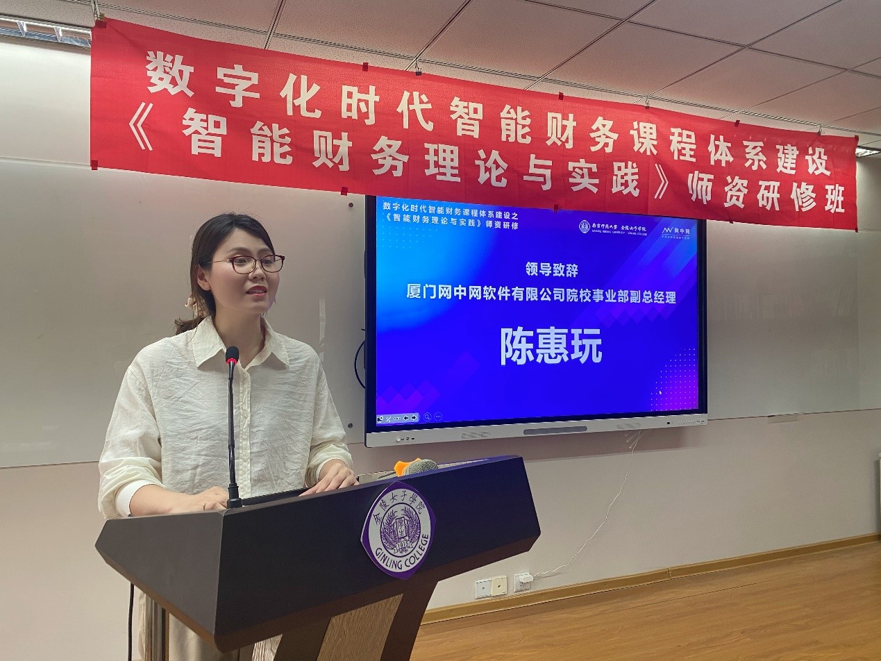的历史,并预祝此次研修班顺利举办。接着厦门网中网软件有限公司院校事业部副总经理陈惠玩女士进行致辞。陈总对未来几天的培训内容进行了简单介绍,并陈述了网中网的运营理念和模式,表达了与更多院校合作的意愿。随后由厦门网中网软件有限公司的高凯老师进行了“数字化变革及数字人才培养”为题的宣讲及“中国石油”和“美的集团”的智能财务实践案例分享。